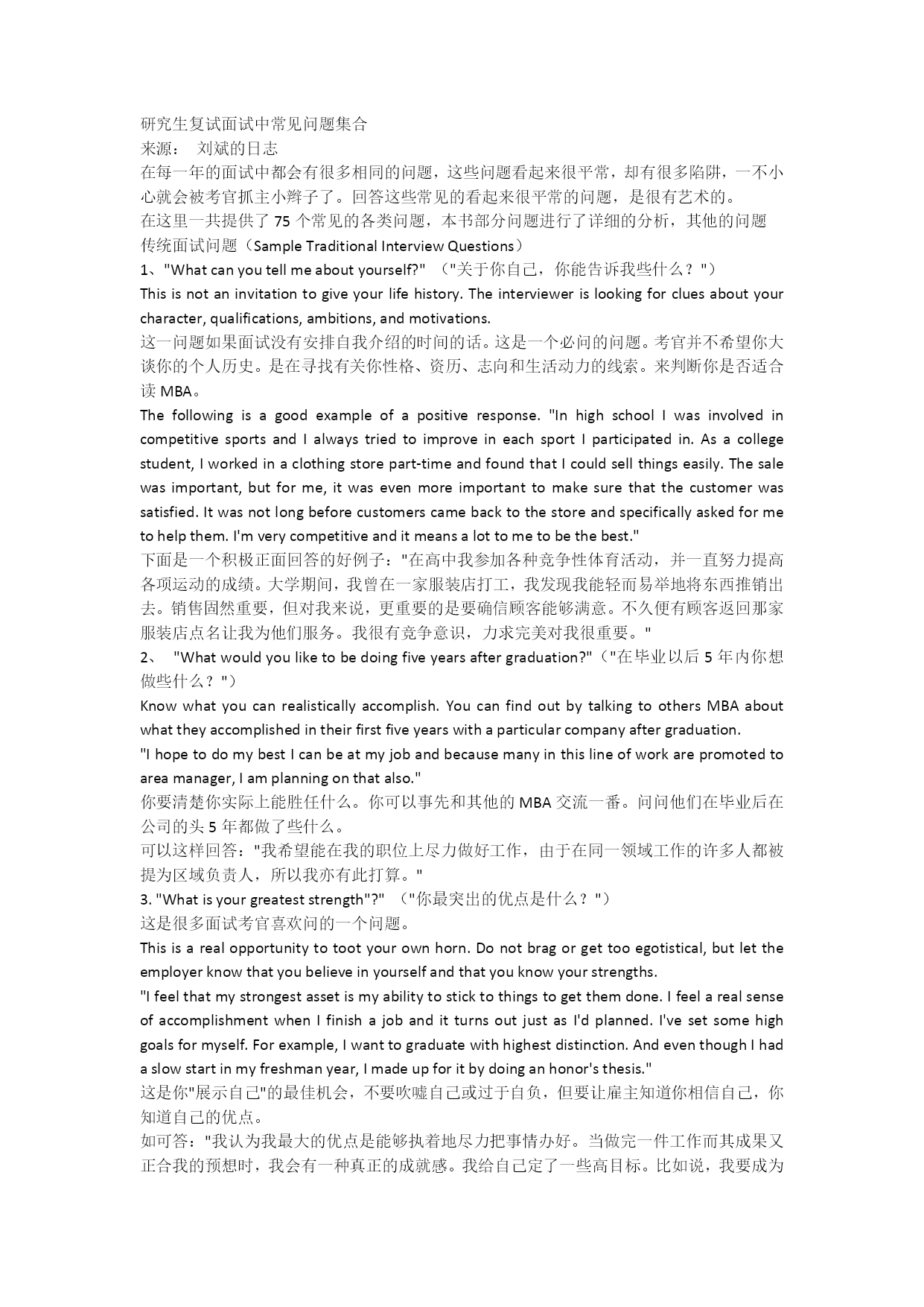 研究生复试面试中常见问题集合来源:刘斌的日志在每一年的面试中都会有很多相同的问题,这些问题看起来很平常,却有很多陷阱,一不小心就会被考官抓主小辫子了。回答这些常见的看起来很平常的问题,是很有艺术的。在这里一共提供了75个常见的各类问题,本书部分问题进行了详细的分析,其他的问题传统面试问题(SampleTraditionalInterviewQuestions)1、"Whatcanyoutellmeaboutyourself?"("关于你自己,你能告诉我些什么?")Thisisnotaninvitation
