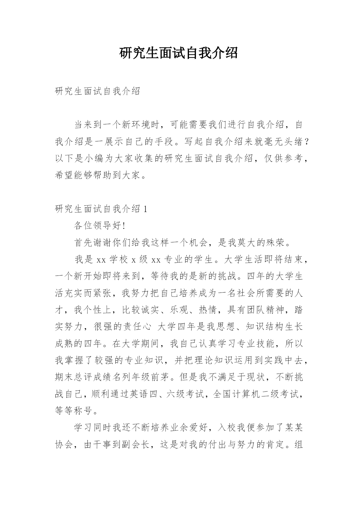 研究生面试自我介绍研究生面试自我介绍当来到一个新环境时,可能需要我们进行自我介绍,自我介绍是一展示自己的手段。写起自我介绍来就毫无头绪?以下是小编为大家收集的研究生面试自我介绍,仅供参考,希望能够帮助到大家。研究生面试自我介绍1各位领导好!首先谢谢你们给我这样一个机会,是我莫大的殊荣。我是xx学校x级xx专业的学生。大学生活即将结束,一个新开始即将来到,等待我的是新的挑战。四年的大学生活充实而紧张,我努力把自己培养成为一名社会所需要的人才,我个性上,比较诚实、乐观、热情,具有团队精神,踏实努力,很强的责任