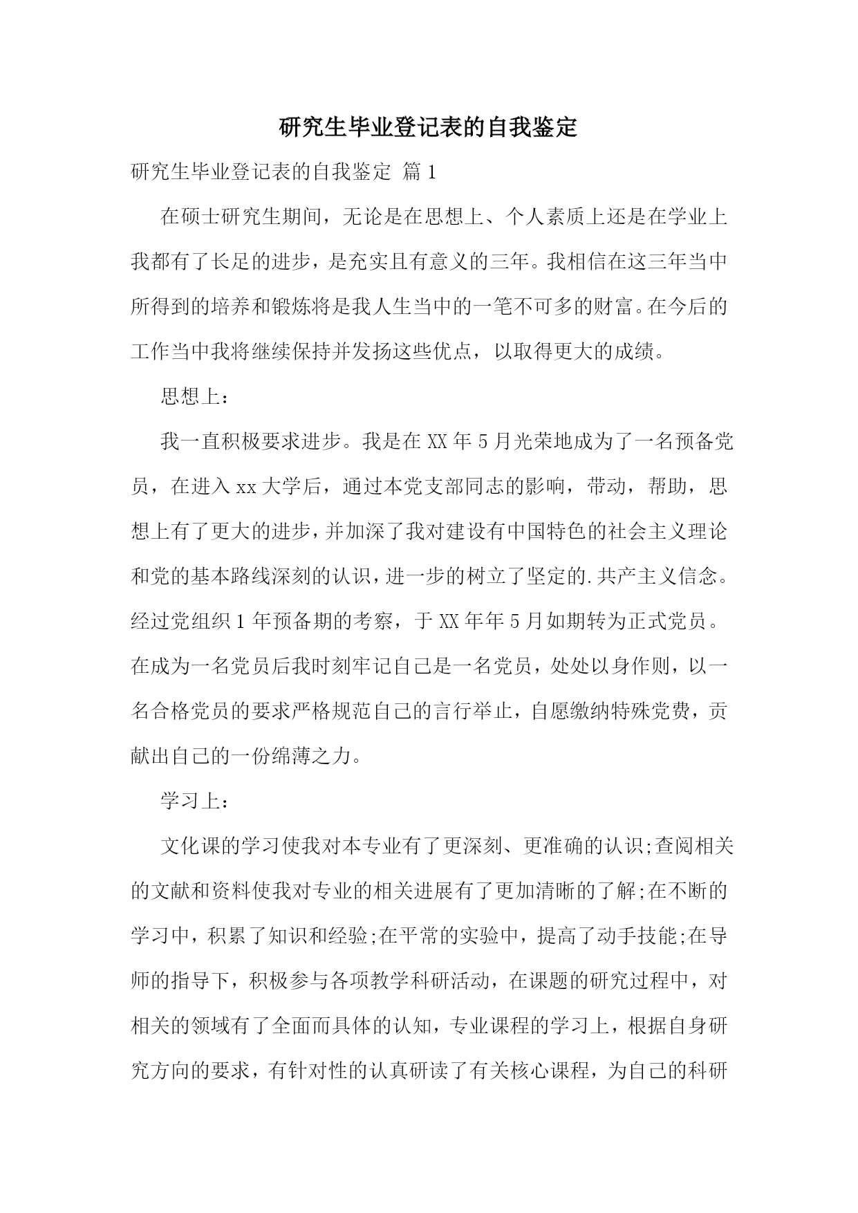 研究生毕业登记表的自我鉴定研究生毕业登记表的自我鉴定篇1在硕士研究生期间,无论是在思想上、个人素质上还是在学业上我都有了长足的进步,是充实且有意义的三年。我相信在这三年当中所得到的培养和锻炼将是我人生当中的一笔不可多的财富。在今后的工作当中我将继续保持并发扬这些优点,以取得更大的成绩。思想上:我一直积极要求进步。我是在XX年5月光荣地成为了一名预备党员,在进入xx大学后,通过本党支部同志的影响,带动,帮助,思想上有了更大的进步,并加深了我对建设有中国特色的社会主义理论和党的基本路线深刻的认识,进一步的树立