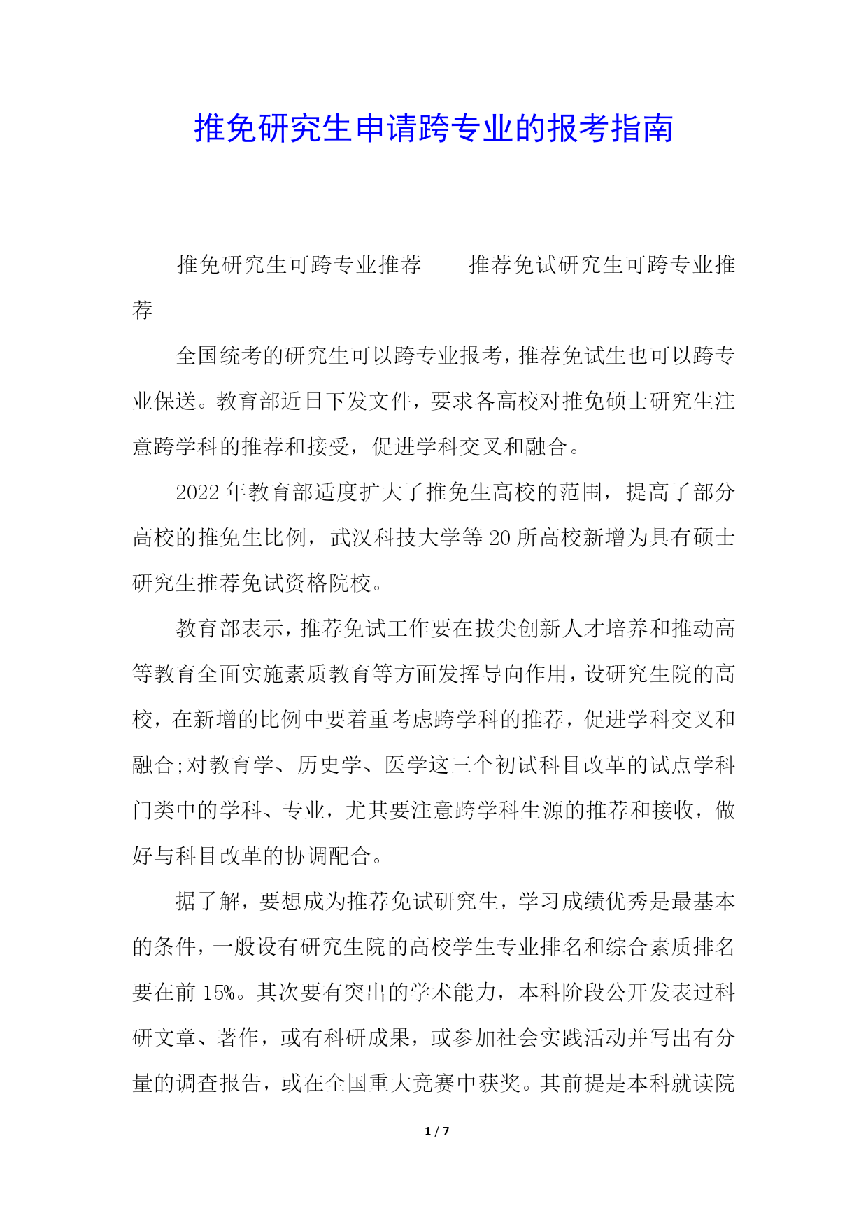 PAGE7/NUMPAGES7推免研究生申请跨专业的报考指南推免研究生可跨专业推荐推荐免试研究生可跨专业推荐全国统考的研究生可以跨专业报考,推荐免试生也可以跨专业保送。教育部近日下发文件,要求各高校对推免硕士研究生注意跨学科的推荐和接受,促进学科交叉和融合。2022年教育部适度扩大了推免生高校的范围,提高了部分高校的推免生比例,武汉科技大学等20所高校新增为具有硕士研究生推荐免试资格院校。教育部表示,推荐免试工作要在拔尖创新人才培养和推动高等教育全面实施素质教育等方面发挥导向作用,设研究生院的