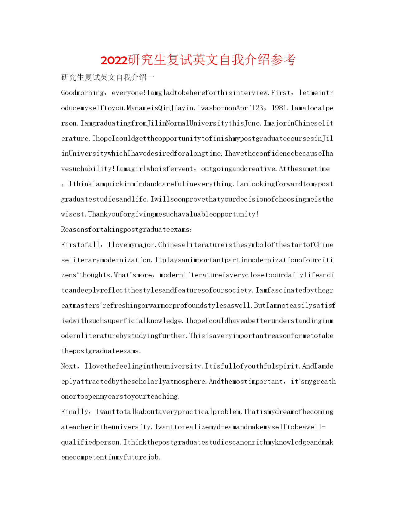 2022研究生复试英文自我介绍参考研究生复试英文自我介绍一Goodmorning,everyone!Iamgladtobehereforthisinterview.First,letmeintroducemyselftoyou.MynameisQinJiayin.IwasbornonApril23,1981.Iamalocalperson.IamgraduatingfromJilinNormalUniversitythisJune.ImajorinChineseliterature.IhopeIcould