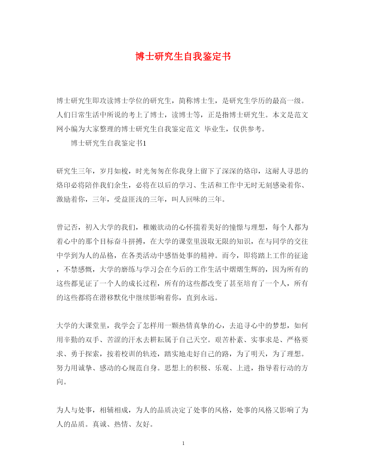此资料由网络收集而来,如有侵权请告知上传者立即删除。资料共分享,我们负责传递知识。PAGEPAGE3博士研究生自我鉴定书博士研究生即攻读博士学位的研究生,简称博士生,是研究生学历的最高一级。人们日常生活中所说的考上了博士,读博士等,正是指博士研究生。本文是范文网小编为大家整理的博士研究生自我鉴定范文毕业生,仅供参考。博士研究生自我鉴定书1研究生三年,岁月如梭,时光匆匆在你我身上留下了深深的烙印,这耐人寻思的烙印必将陪伴我们余生,必将在以后的学习、生活和工作中无时无刻感染着你、激励着你,三年,受