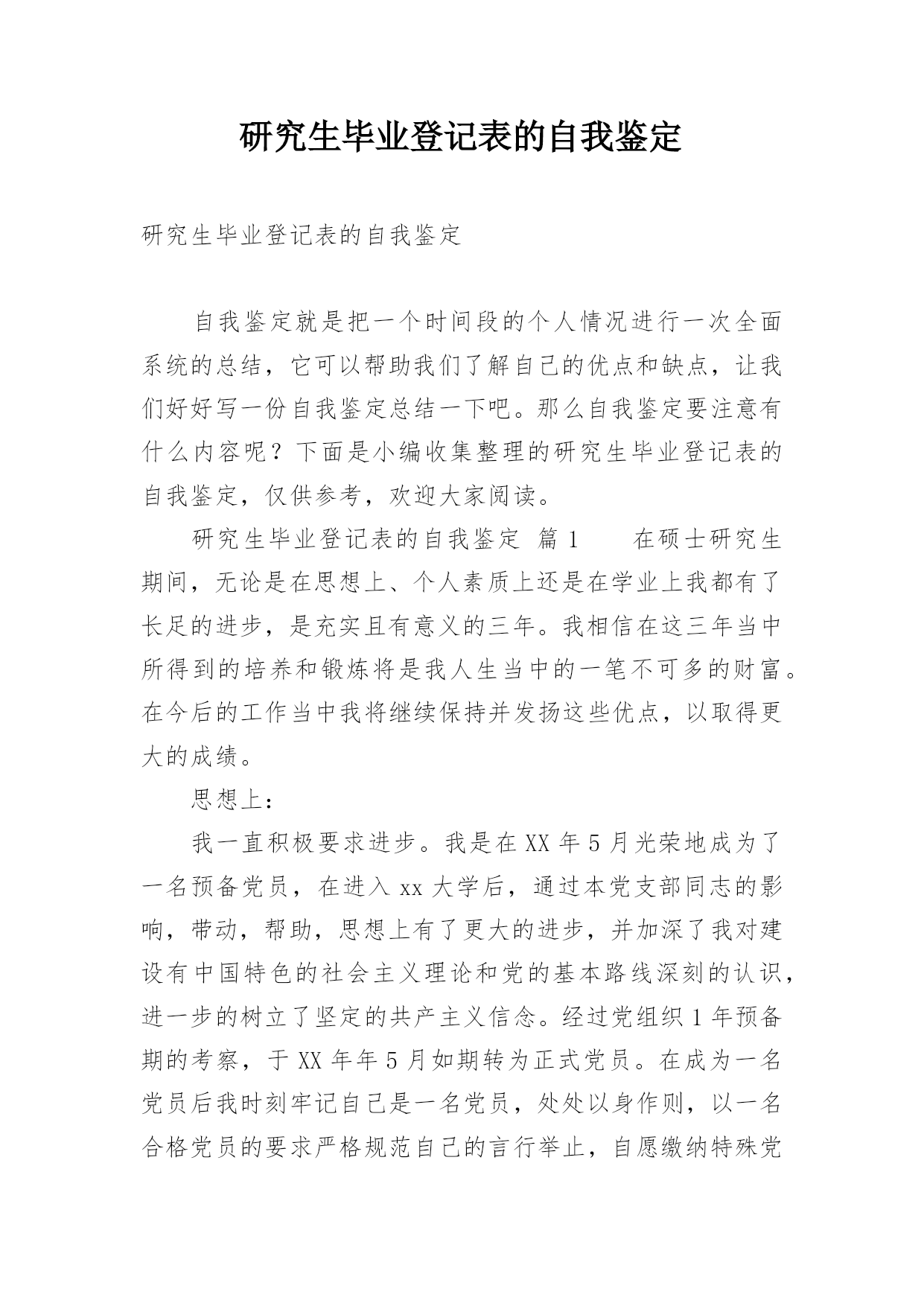 研究生毕业登记表的自我鉴定研究生毕业登记表的自我鉴定自我鉴定就是把一个时间段的个人情况进行一次全面系统的总结,它可以帮助我们了解自己的优点和缺点,让我们好好写一份自我鉴定总结一下吧。那么自我鉴定要注意有什么内容呢?下面是小编收集整理的研究生毕业登记表的自我鉴定,仅供参考,欢迎大家阅读。研究生毕业登记表的自我鉴定篇1在硕士研究生期间,无论是在思想上、个人素质上还是在学业上我都有了长足的进步,是充实且有意义的三年。我相信在这三年当中所得到的培养和锻炼将是我人生当中的一笔不可多的财富。在今后的工作当中我将继续保