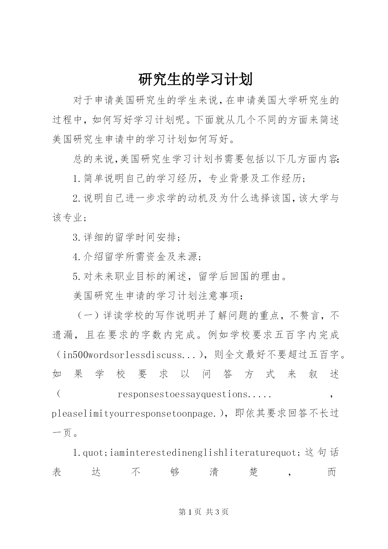 第PAGE\*Arabic\*MERGEFORMAT3页共NUMPAGES\*MERGEFORMAT3页研究生的学习计划对于申请美国研究生的学生来说,在申请美国大学研究生的过程中,如何写好学习计划呢。下面就从几个不同的方面来简述美国研究生申请中的学习计划如何写好。总的来说,美国研究生学习计划书需要包括以下几方面内容:1.简单说明自己的学习经历,专业背景及工作经历;2.说明自己进一步求学的动机及为什么选择该国,该大学与该专业;3.详细的留学时间安排;4.介绍留学所需资金及来源;5.对未来职业目标
