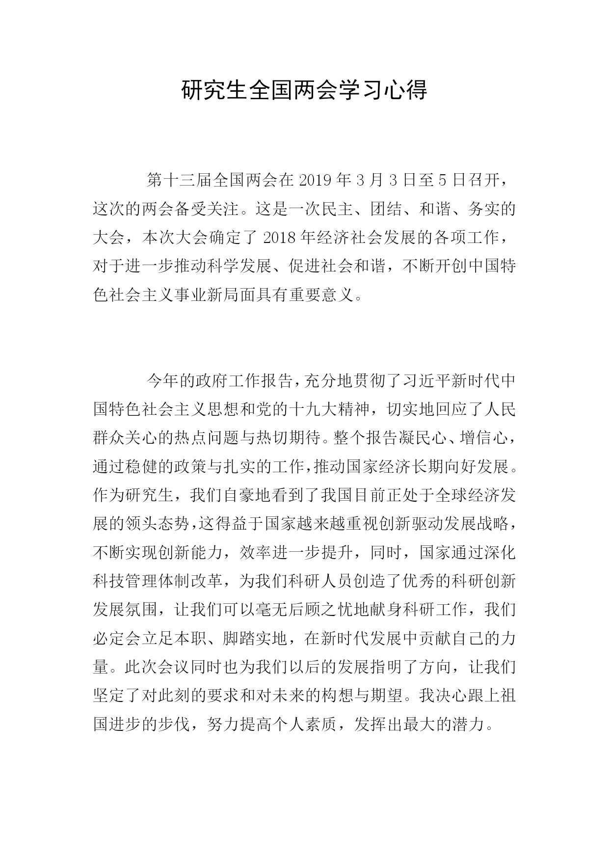 研究生全国两会学习心得第十三届全国两会在2019年3月3日至5日召开,这次的两会备受关注。这是一次民主、团结、和谐、务实的大会,本次大会确定了2018年经济社会发展的各项工作,对于进一步推动科学发展、促进社会和谐,不断开创中国特色社会主义事业新局面具有重要意义。今年的政府工作报告,充分地贯彻了习近平新时代中国特色社会主义思想和党的十九大精神,切实地回应了人民群众关心的热点问题与热切期待。整个报告凝民心、增信心,通过稳健的政策与扎实的工作,推动国家经济长期向好发展。作为研究生,我们自豪地看到了我国目前正处于