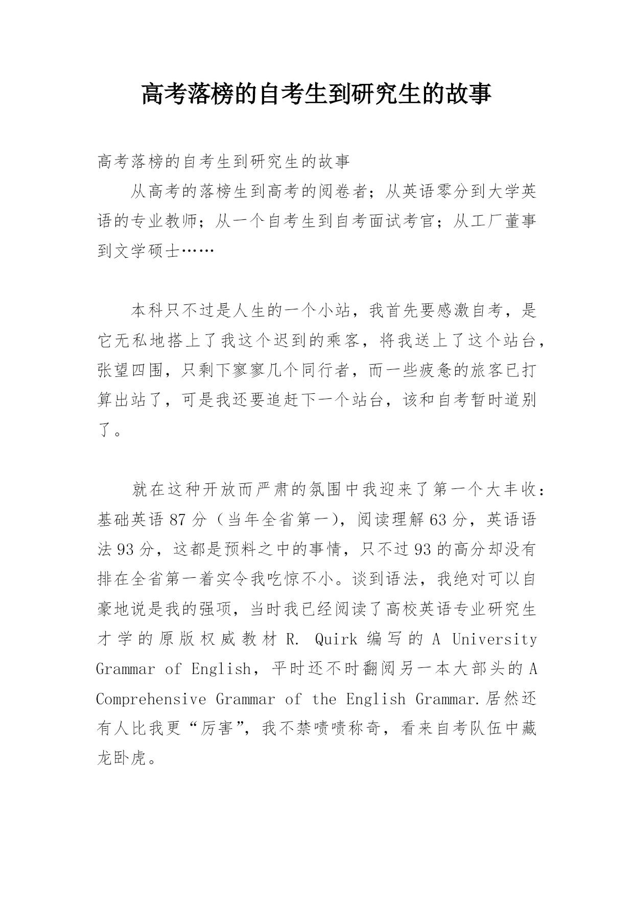 高考落榜的自考生到研究生的故事高考落榜的自考生到研究生的故事从高考的落榜生到高考的阅卷者;从英语零分到大学英语的专业教师;从一个自考生到自考面试考官;从工厂董事到文学硕士……本科只不过是人生的一个小站,我首先要感激自考,是它无私地搭上了我这个迟到的乘客,将我送上了这个站台,张望四围,只剩下寥寥几个同行者,而一些疲惫的旅客已打算出站了,可是我还要追赶下一个站台,该和自考暂时道别了。就在这种开放而严肃的氛围中我迎来了第一个大丰收:基础英语87分(当年全省第一),阅读理解63分,英语语法93分,这都是预料之中的