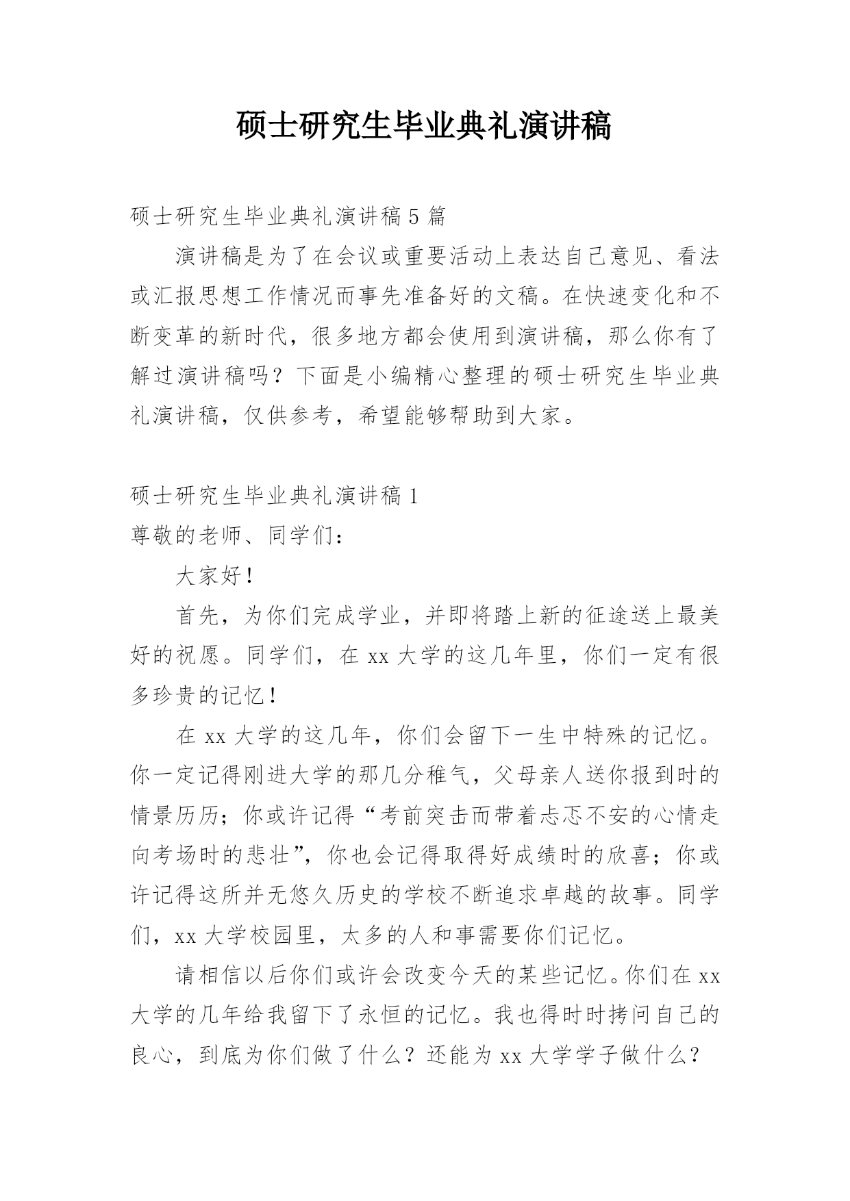 硕士研究生毕业典礼演讲稿硕士研究生毕业典礼演讲稿5篇演讲稿是为了在会议或重要活动上表达自己意见、看法或汇报思想工作情况而事先准备好的文稿。在快速变化和不断变革的新时代,很多地方都会使用到演讲稿,那么你有了解过演讲稿吗?下面是小编精心整理的硕士研究生毕业典礼演讲稿,仅供参考,希望能够帮助到大家。硕士研究生毕业典礼演讲稿1尊敬的老师、同学们:大家好!首先,为你们完成学业,并即将踏上新的征途送上最美好的祝愿。同学们,在xx大学的这几年里,你们一定有很多珍贵的记忆!在xx大学的这几年,你们会留下一生中特殊的记忆。