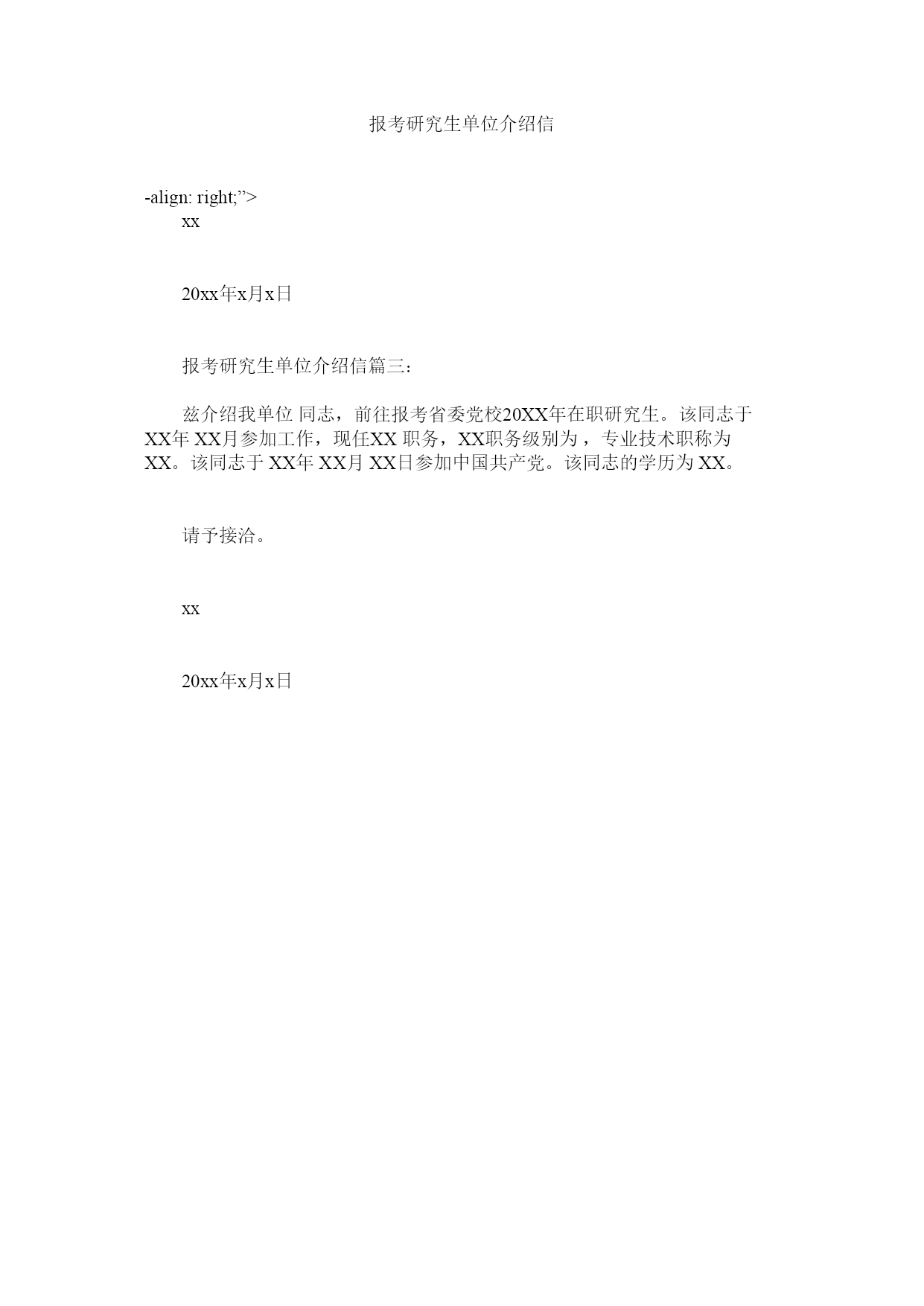 报考研究生单位介绍信-align:right;”>xx20xx年x月x日报考研究生单位介绍信篇三:兹介绍我单位同志,前往报考省委党校20XX年在职研究生。该同志于XX年XX月参加工作,现任XX职务,XX职务级别为,专业技术职称为XX。该同志于XX年XX月XX日参加中国共产党。该同志的学历为XX。请予接洽。xx20xx年x月x日