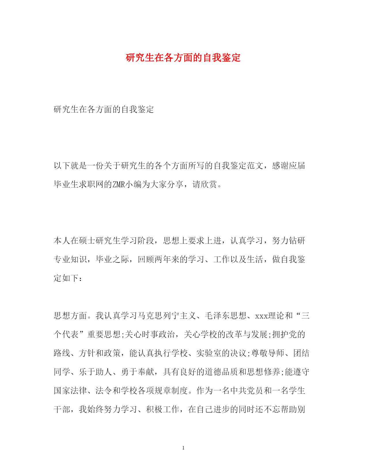 此资料由网络收集而来,如有侵权请告知上传者立即删除。资料共分享,我们负责传递知识。PAGEPAGE3研究生在各方面的自我鉴定研究生在各方面的自我鉴定以下就是一份关于研究生的各个方面所写的自我鉴定范文,感谢应届毕业生求职网的ZMR小编为大家分享,请欣赏。本人在硕士研究生学习阶段,思想上要求上进,认真学习,努力钻研专业知识,毕业之际,回顾两年来的学习、工作以及生活,做自我鉴定如下:思想方面。我认真学习马克思列宁主义、毛泽东思想、xxx理论和“三个代表”重要思想;关心时事政治,关心学校的改革与发展;