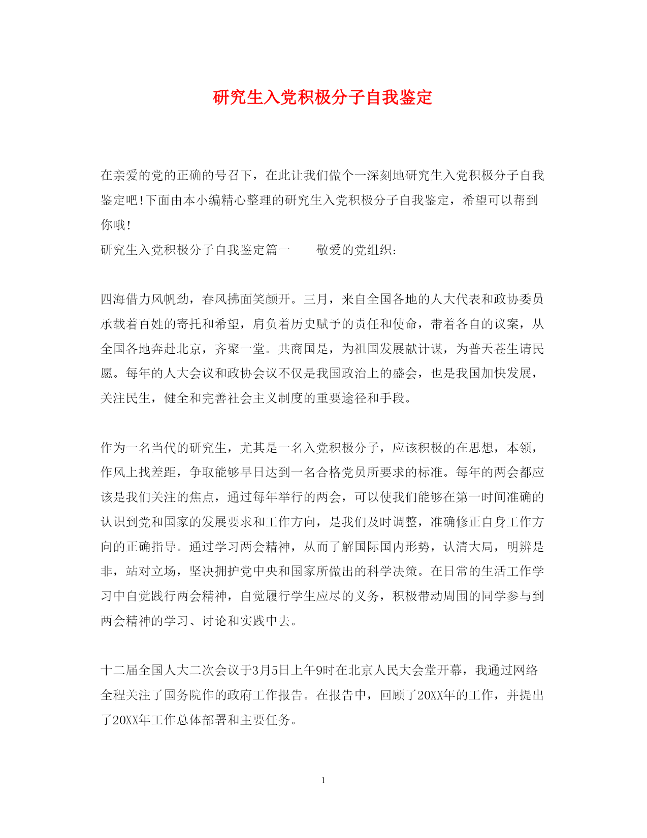 此资料由网络收集而来,如有侵权请告知上传者立即删除。资料共分享,我们负责传递知识。PAGEPAGE6研究生入党积极分子自我鉴定在亲爱的党的正确的号召下,在此让我们做个一深刻地研究生入党积极分子自我鉴定吧!下面由本小编精心整理的研究生入党积极分子自我鉴定,希望可以帮到你哦!研究生入党积极分子自我鉴定篇一敬爱的党组织:四海借力风帆劲,春风拂面笑颜开。三月,来自全国各地的人大代表和政协委员承载着百姓的寄托和希望,肩负着历史赋予的责任和使命,带着各自的议案,从全国各地奔赴北京,齐聚一堂。共商国是,为祖