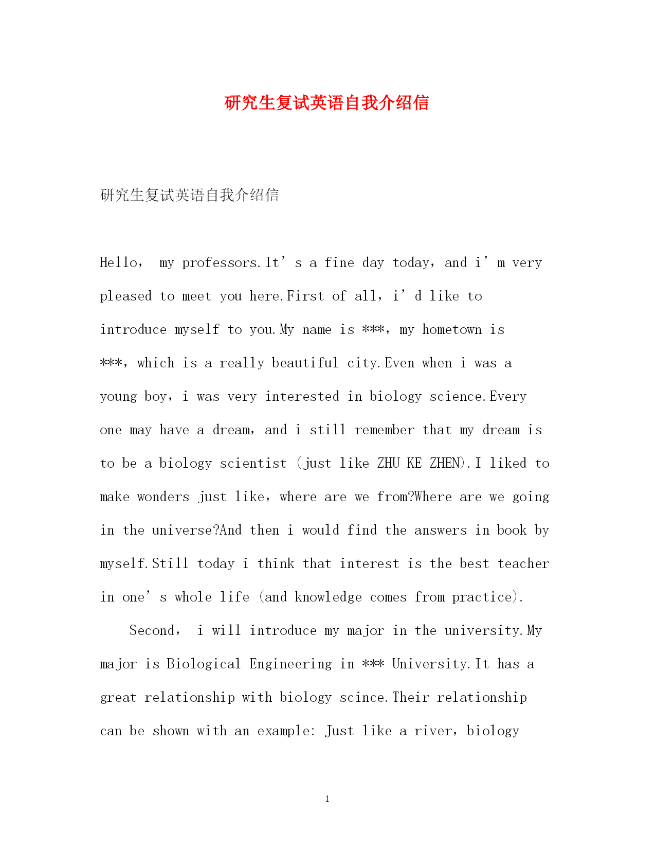 此资料由网络收集而来,如有侵权请告知上传者立即删除。资料共分享,我们负责传递知识。PAGEPAGE3研究生复试英语自我介绍信研究生复试英语自我介绍信Hello,myprofessors.It’safinedaytoday,andi’mverypleasedtomeetyouhere.Firstofall,i’dliketointroducemyselftoyou.Mynameis***,myhometownis***,whichisareallybeautifulcity.Evenwheniw