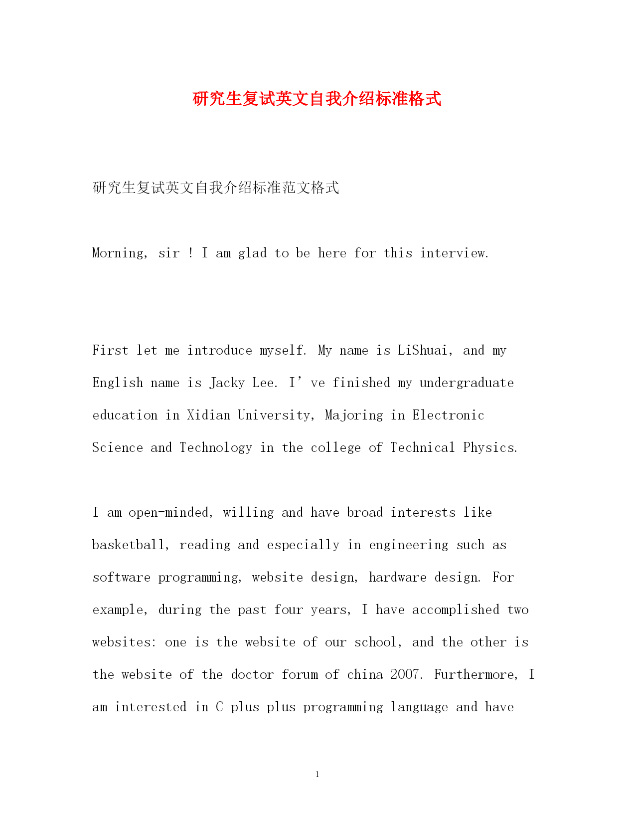 此资料由网络收集而来,如有侵权请告知上传者立即删除。资料共分享,我们负责传递知识。PAGEPAGE3研究生复试英文自我介绍标准格式研究生复试英文自我介绍标准范文格式Morning,sir!Iamgladtobehereforthisinterview.Firstletmeintroducemyself.MynameisLiShuai,andmyEnglishnameisJackyLee.I’vefinishedmyundergraduateeducationinXidianUniversity