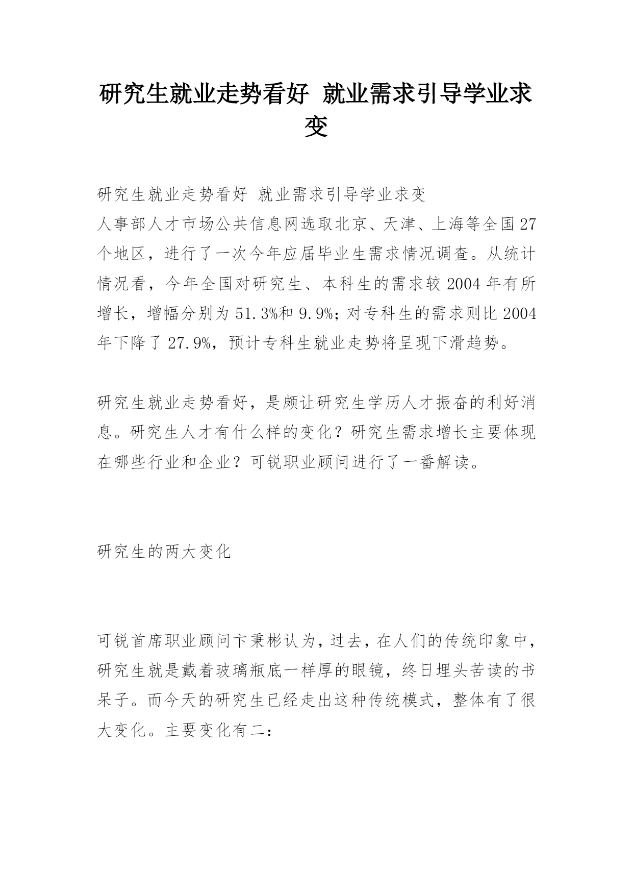 研究生就业走势看好就业需求引导学业求变研究生就业走势看好就业需求引导学业求变人事部人才市场公共信息网选取北京、天津、上海等全国27个地区,进行了一次今年应届毕业生需求情况调查。从统计情况看,今年全国对研究生、本科生的需求较2004年有所增长,增幅分别为51.3%和9.9%;对专科生的需求则比2004年下降了27.9%,预计专科生就业走势将呈现下滑趋势。研究生就业走势看好,是颇让研究生学历人才振奋的利好消息。研究生人才有什么样的变化?研究生需求增长主要体现在哪些行业和企业?可锐职业顾问进行了一番解读。研究生