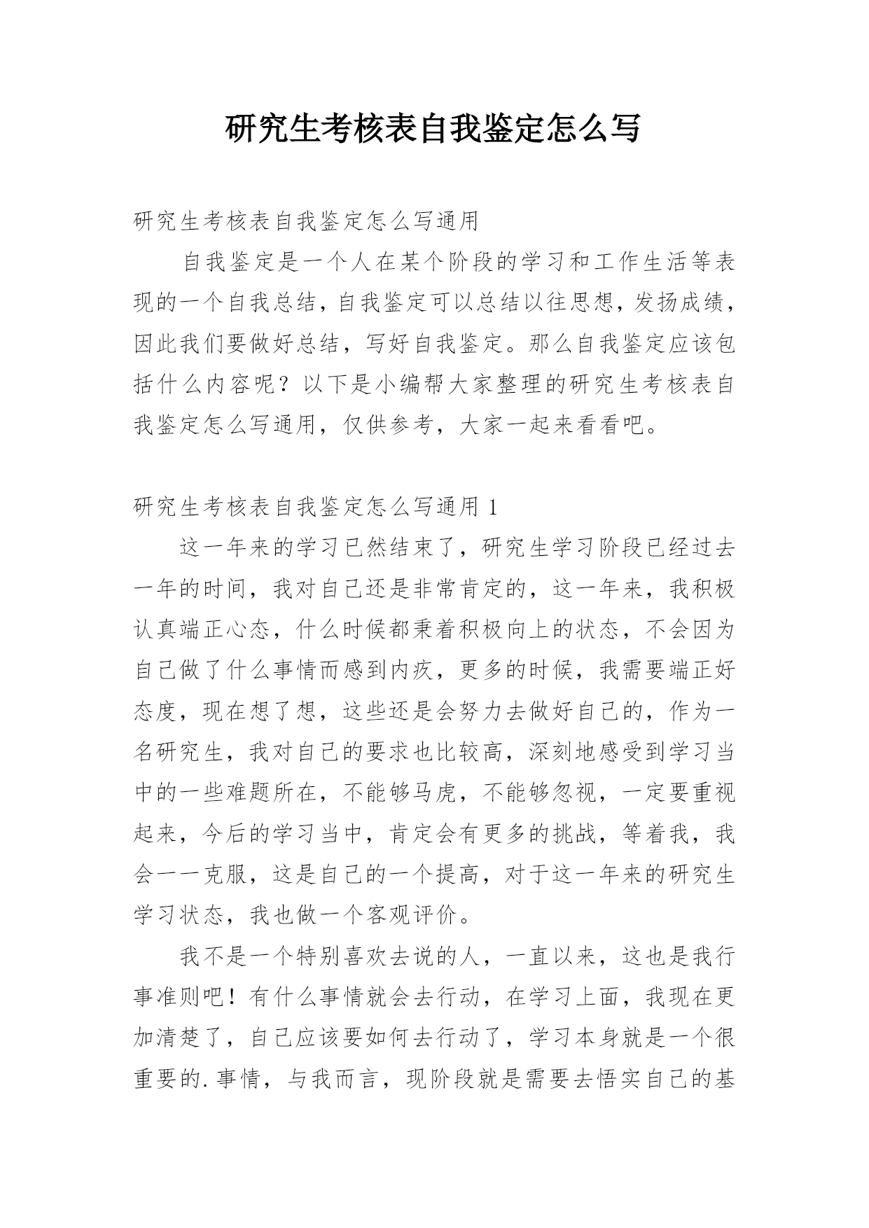 研究生考核表自我鉴定怎么写研究生考核表自我鉴定怎么写通用自我鉴定是一个人在某个阶段的学习和工作生活等表现的一个自我总结,自我鉴定可以总结以往思想,发扬成绩,因此我们要做好总结,写好自我鉴定。那么自我鉴定应该包括什么内容呢?以下是小编帮大家整理的研究生考核表自我鉴定怎么写通用,仅供参考,大家一起来看看吧。研究生考核表自我鉴定怎么写通用1这一年来的学习已然结束了,研究生学习阶段已经过去一年的时间,我对自己还是非常肯定的,这一年来,我积极认真端正心态,什么时候都秉着积极向上的状态,不会因为自己做了什么事情而感到