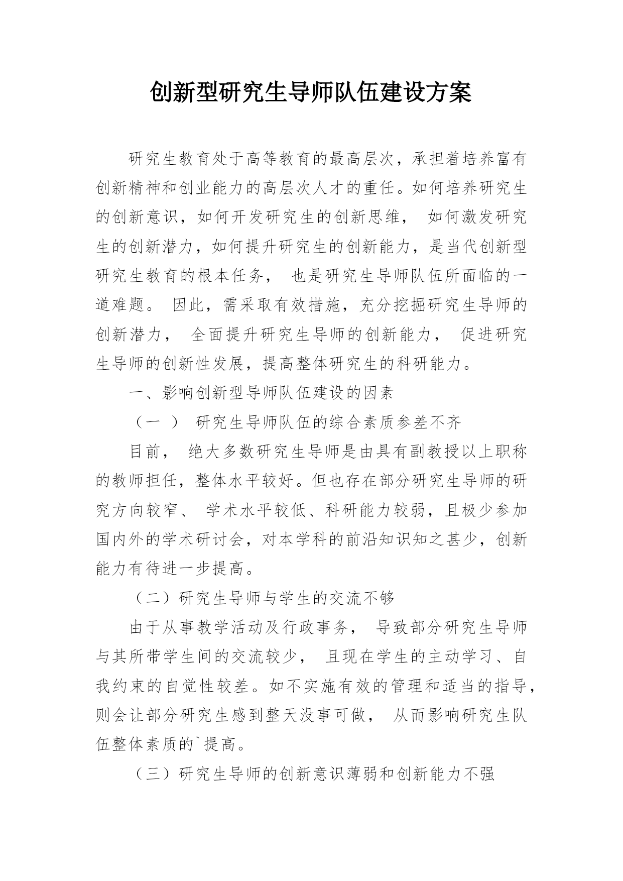 创新型研究生导师队伍建设方案研究生教育处于高等教育的最高层次,承担着培养富有创新精神和创业能力的高层次人才的重任。如何培养研究生的创新意识,如何开发研究生的创新思维,如何激发研究生的创新潜力,如何提升研究生的创新能力,是当代创新型研究生教育的根本任务,也是研究生导师队伍所面临的一道难题。因此,需采取有效措施,充分挖掘研究生导师的创新潜力,全面提升研究生导师的创新能力,促进研究生导师的创新性发展,提高整体研究生的科研能力。一、影响创新型导师队伍建设的因素(一)研究生导师队伍的综合素质参差不齐目前,绝大多数研