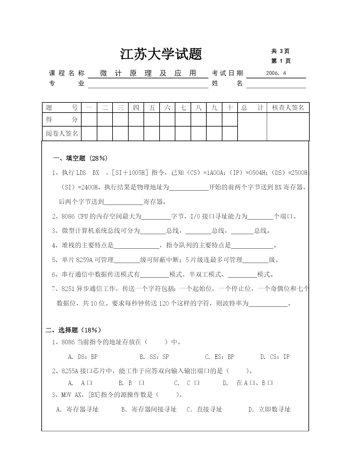 江苏大学试题课程名称微计原理及应用考试日期2006.4专业姓名题号一二三四五六七八九十总计核查人签名得分阅卷人签名一、填空题(28%)1、执行LDSBX,[SI+1005H]指令,已知(CS)=1A00A;(IP)=0504H;(DS)=2500H;(SI)=2400H。执行结果是物理地址为开始的前两个字节送到BX寄存器,后两个字节送到寄存器。2、8086CPU的内存空间最大为字节,I/O接口寻址能力为个端口。3、微型计算机系统总线可分为总线,总线,总线。4、堆栈的主要特点是,指令队列的主要特点是。5、单