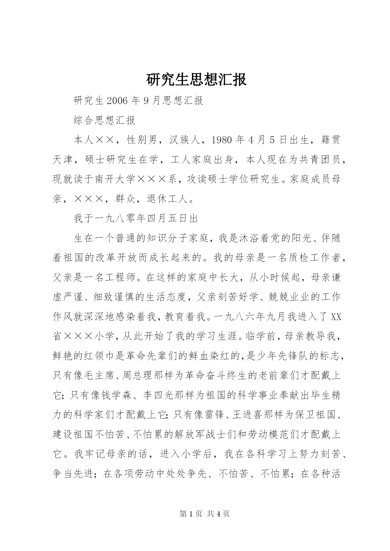第PAGE\*Arabic\*MERGEFORMAT4页共NUMPAGES\*MERGEFORMAT4页研究生思想汇报研究生2006年9月思想汇报综合思想汇报本人××,性别男,汉族人,1980年4月5日出生,籍贯天津,硕士研究生在学,工人家庭出身,本人现在为共青团员,现就读于南开大学×××系,攻读硕士学位研究生。家庭成员母亲,×××,群众,退休工人。我于一九八零年四月五日出生在一个普通的知识分子家庭,我是沐浴着党的阳光、伴随着祖国的改革开放而成长起来的。我的母亲是一名质检工作者,父亲是一名工程