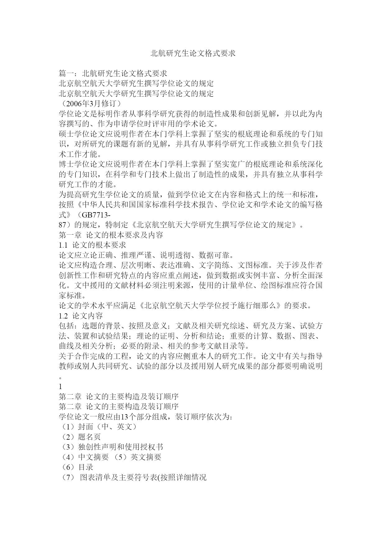 北航研究生论文格式要求篇一:北航研究生论文格式要求北京航空航天大学研究生撰写学位论文的规定北京航空航天大学研究生撰写学位论文的规定(2006年3月修订)学位论文是标明作者从事科学研究获得的制造性成果和创新见解,并以此为内容撰写的、作为申请学位时评审用的学术论文。硕士学位论文应说明作者在本门学科上掌握了坚实的根底理论和系统的专门知识,对所研究的课题有新的见解,并具有从事科学研究工作或独立担负专门技术工作才能。博士学位论文应说明作者在本门学科上掌握了坚实宽广的根底理论和系统深化的专门知识,在科学和专门技术上做