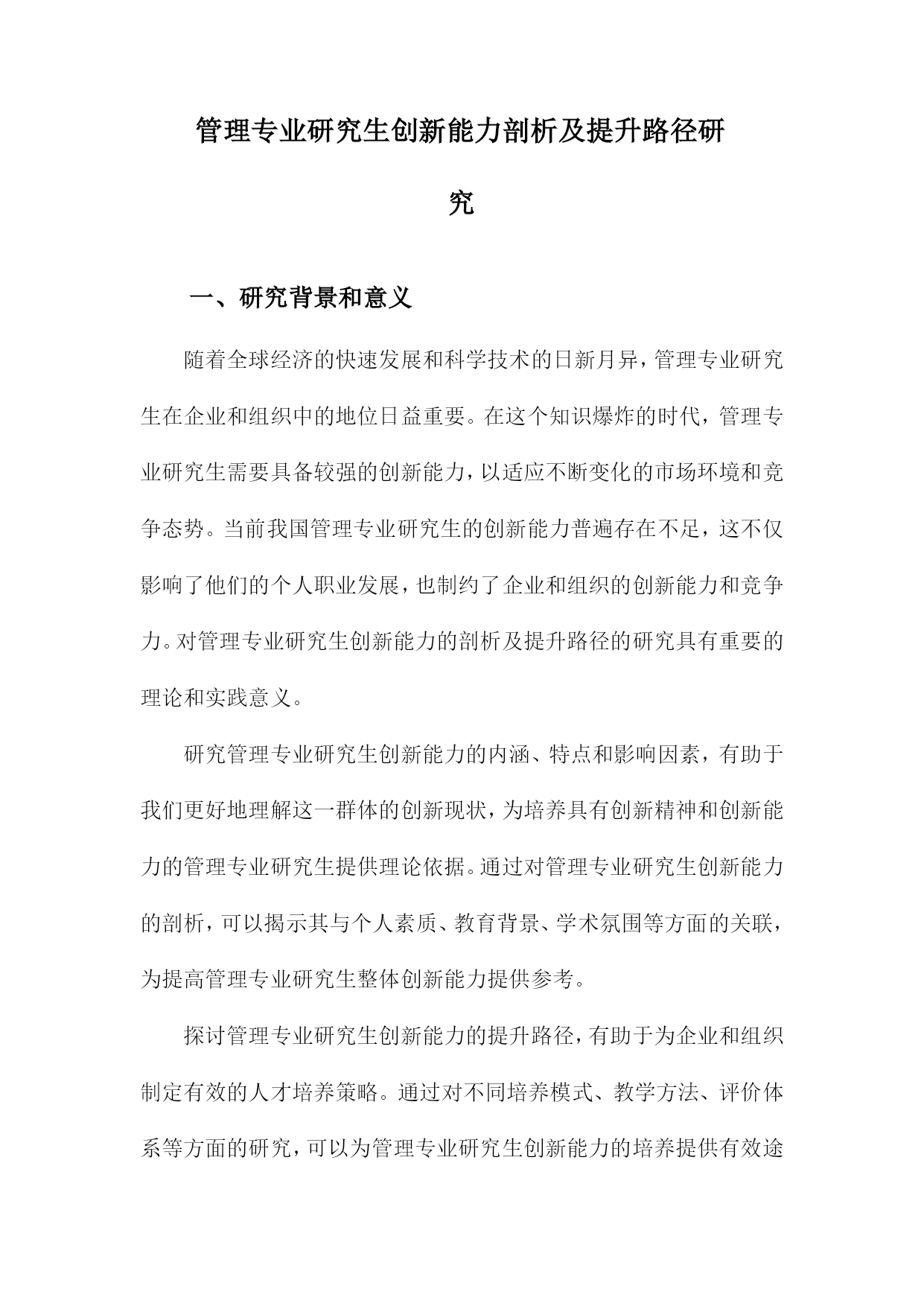 管理专业研究生创新能力剖析及提升路径研究一、研究背景和意义随着全球经济的快速发展和科学技术的日新月异,管理专业研究生在企业和组织中的地位日益重要。在这个知识爆炸的时代,管理专业研究生需要具备较强的创新能力,以适应不断变化的市场环境和竞争态势。当前我国管理专业研究生的创新能力普遍存在不足,这不仅影响了他们的个人职业发展,也制约了企业和组织的创新能力和竞争力。对管理专业研究生创新能力的剖析及提升路径的研究具有重要的理论和实践意义。研究管理专业研究生创新能力的内涵、特点和影响因素,有助于我们更好地理解这一群体的
