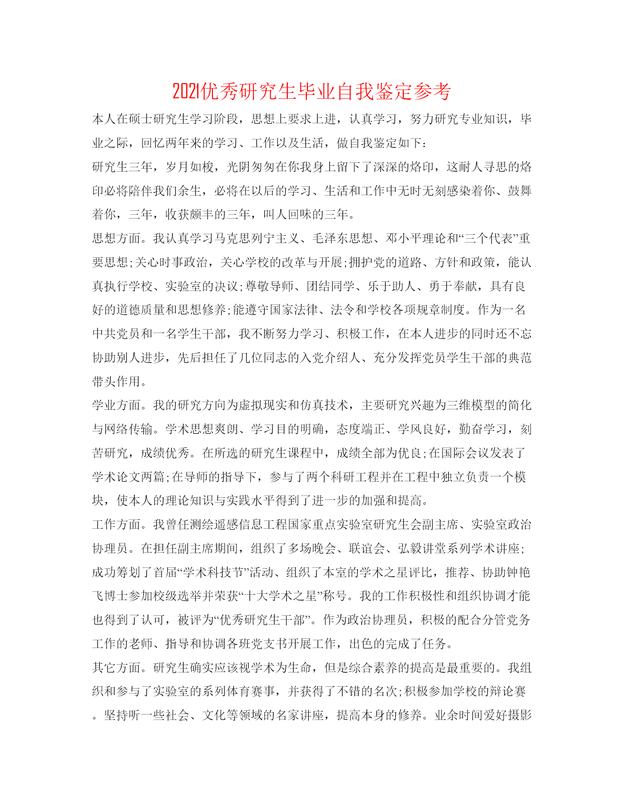 2021优秀研究生毕业自我鉴定参考本人在硕士研究生学习阶段,思想上要求上进,认真学习,努力研究专业知识,毕业之际,回忆两年来的学习、工作以及生活,做自我鉴定如下:研究生三年,岁月如梭,光阴匆匆在你我身上留下了深深的烙印,这耐人寻思的烙印必将陪伴我们余生,必将在以后的学习、生活和工作中无时无刻感染着你、鼓舞着你,三年,收获颇丰的三年,叫人回味的三年。思想方面。我认真学习马克思列宁主义、毛泽东思想、邓小平理论和“三个代表”重要思想;关心时事政治,关心学校的改革与开展;拥护党的道路、方针和政策,能认真执行学校、