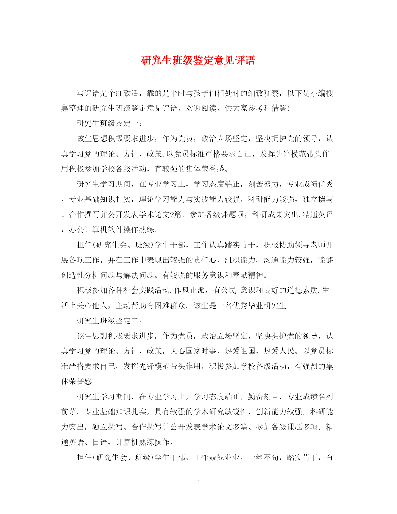 此资料由网络收集而来,如有侵权请告知上传者立即删除。资料共分享,我们负责传递知识。PAGEPAGE3研究生班级鉴定意见评语写评语是个细致活,靠的是平时与孩子们相处时的细致观察,以下是小编搜集整理的研究生班级鉴定意见评语,欢迎阅读,供大家参考和借鉴!研究生班级鉴定一:该生思想积极要求进步,作为党员,政治立场坚定,坚决拥护党的领导,认真学习党的理论、方针、政策.以党员标准严格要求自己,发挥先锋模范带头作用积极参加学校各级活动,有较强的集体荣誉感。研究生学习期间,在专业学习上,学习态度端正,刻苦努力