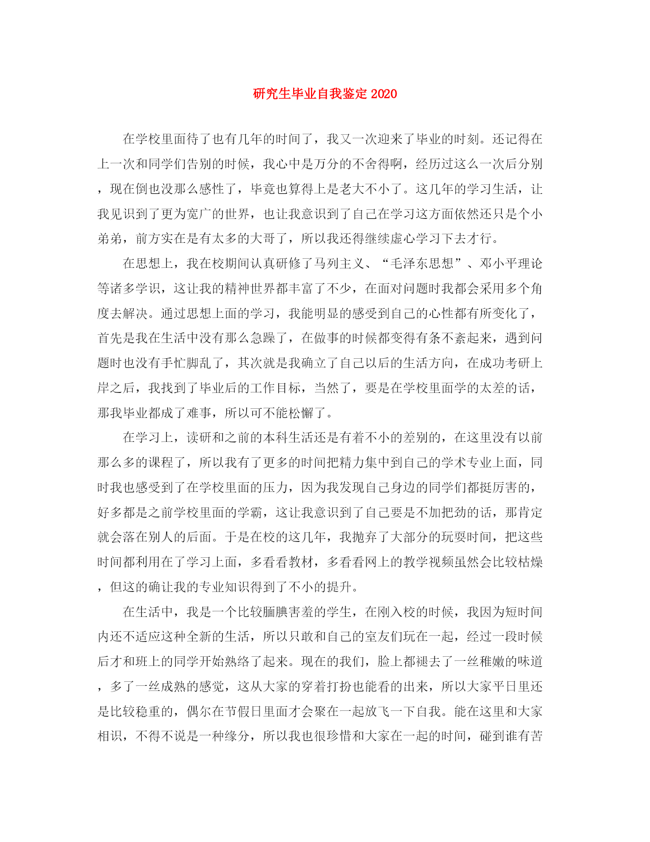 此资料由网络收集而来,如有侵权请告知上传者立即删除。资料共分享,我们负责传递知识。研究生毕业自我鉴定2020在学校里面待了也有几年的时间了,我又一次迎来了毕业的时刻。还记得在上一次和同学们告别的时候,我心中是万分的不舍得啊,经历过这么一次后分别,现在倒也没那么感性了,毕竟也算得上是老大不小了。这几年的学习生活,让我见识到了更为宽广的世界,也让我意识到了自己在学习这方面依然还只是个小弟弟,前方实在是有太多的大哥了,所以我还得继续虚心学习下去才行。在思想上,我在校期间认真研修了马列主义、“毛泽东思想”、邓小平