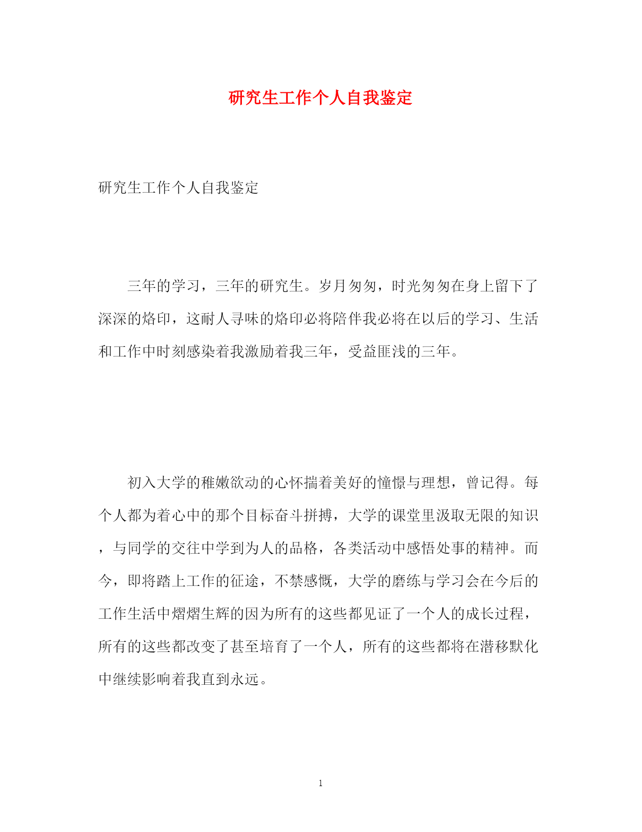 此资料由网络收集而来,如有侵权请告知上传者立即删除。资料共分享,我们负责传递知识。PAGEPAGE3研究生工作个人自我鉴定研究生工作个人自我鉴定三年的学习,三年的研究生。岁月匆匆,时光匆匆在身上留下了深深的烙印,这耐人寻味的烙印必将陪伴我必将在以后的学习、生活和工作中时刻感染着我激励着我三年,受益匪浅的三年。初入大学的稚嫩欲动的心怀揣着美好的憧憬与理想,曾记得。每个人都为着心中的那个目标奋斗拼搏,大学的课堂里汲取无限的知识,与同学的交往中学到为人的品格,各类活动中感悟处事的精神。而今,即将踏上