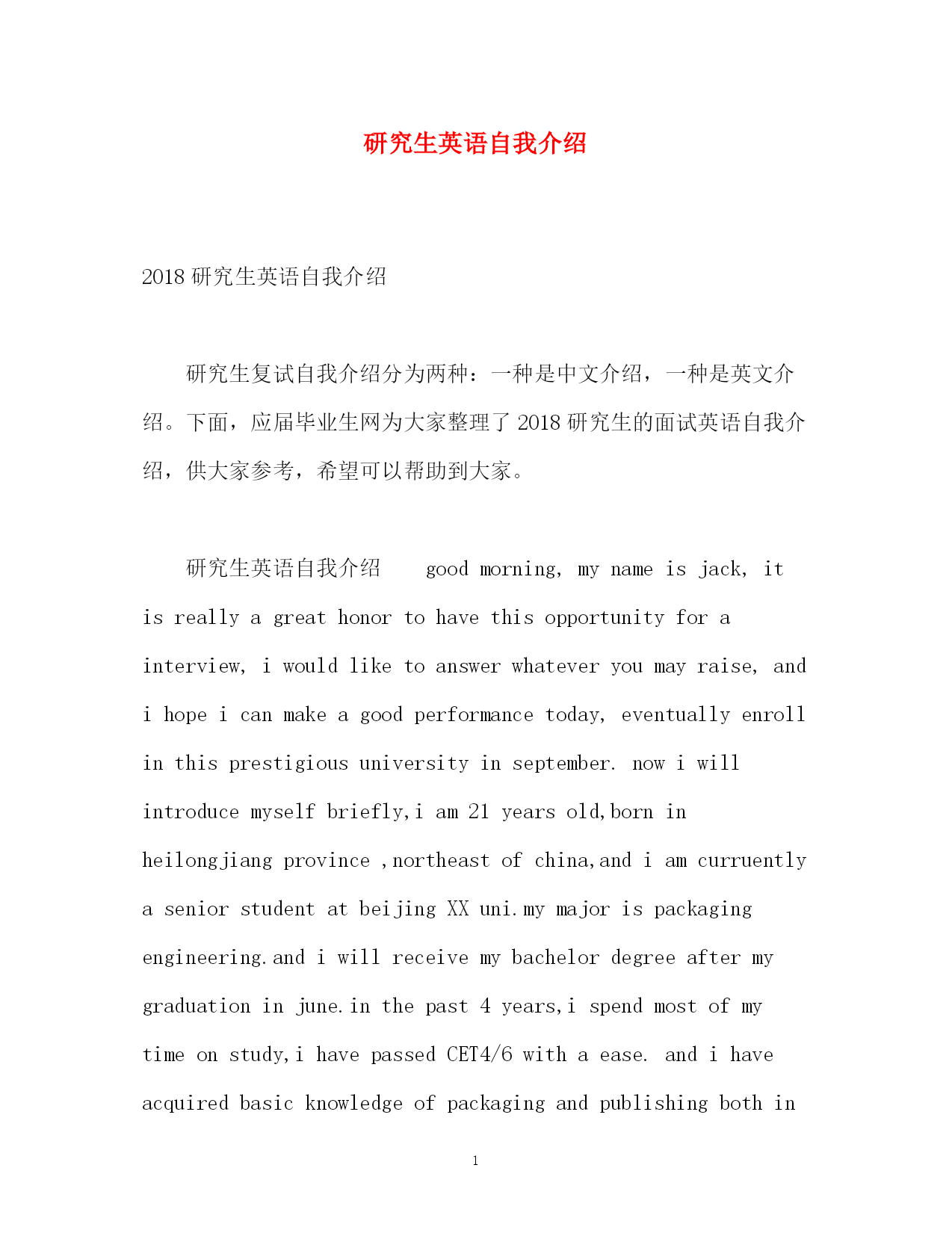 此资料由网络收集而来,如有侵权请告知上传者立即删除。资料共分享,我们负责传递知识。PAGEPAGE4研究生英语自我介绍2018研究生英语自我介绍研究生复试自我介绍分为两种:一种是中文介绍,一种是英文介绍。下面,应届毕业生网为大家整理了2018研究生的面试英语自我介绍,供大家参考,希望可以帮助到大家。研究生英语自我介绍goodmorning,mynameisjack,itisreallyagreathonortohavethisopportunityforainterview,iwouldlik