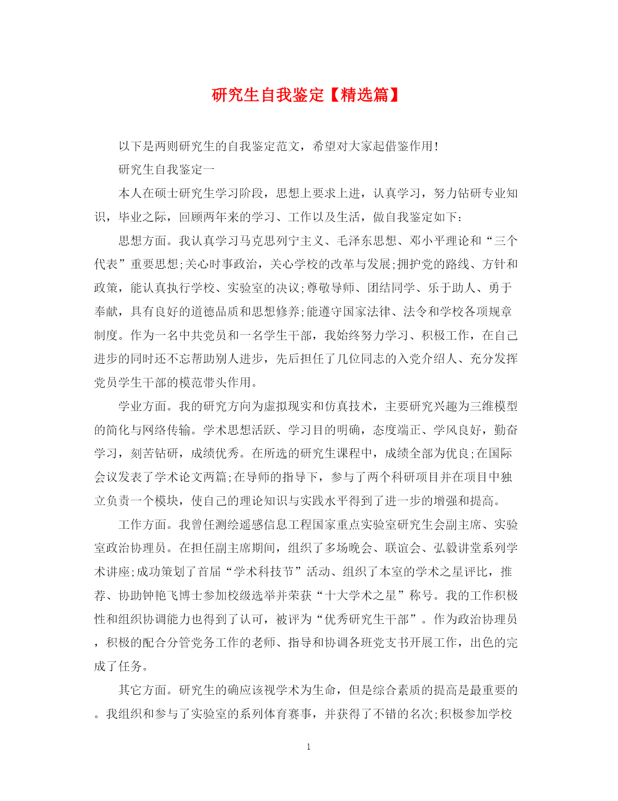 此资料由网络收集而来,如有侵权请告知上传者立即删除。资料共分享,我们负责传递知识。PAGEPAGE3研究生自我鉴定【精选篇】以下是两则研究生的自我鉴定范文,希望对大家起借鉴作用!研究生自我鉴定一本人在硕士研究生学习阶段,思想上要求上进,认真学习,努力钻研专业知识,毕业之际,回顾两年来的学习、工作以及生活,做自我鉴定如下:思想方面。我认真学习马克思列宁主义、毛泽东思想、邓小平理论和“三个代表”重要思想;关心时事政治,关心学校的改革与发展;拥护党的路线、方针和政策,能认真执行学校、实验室的决议;尊