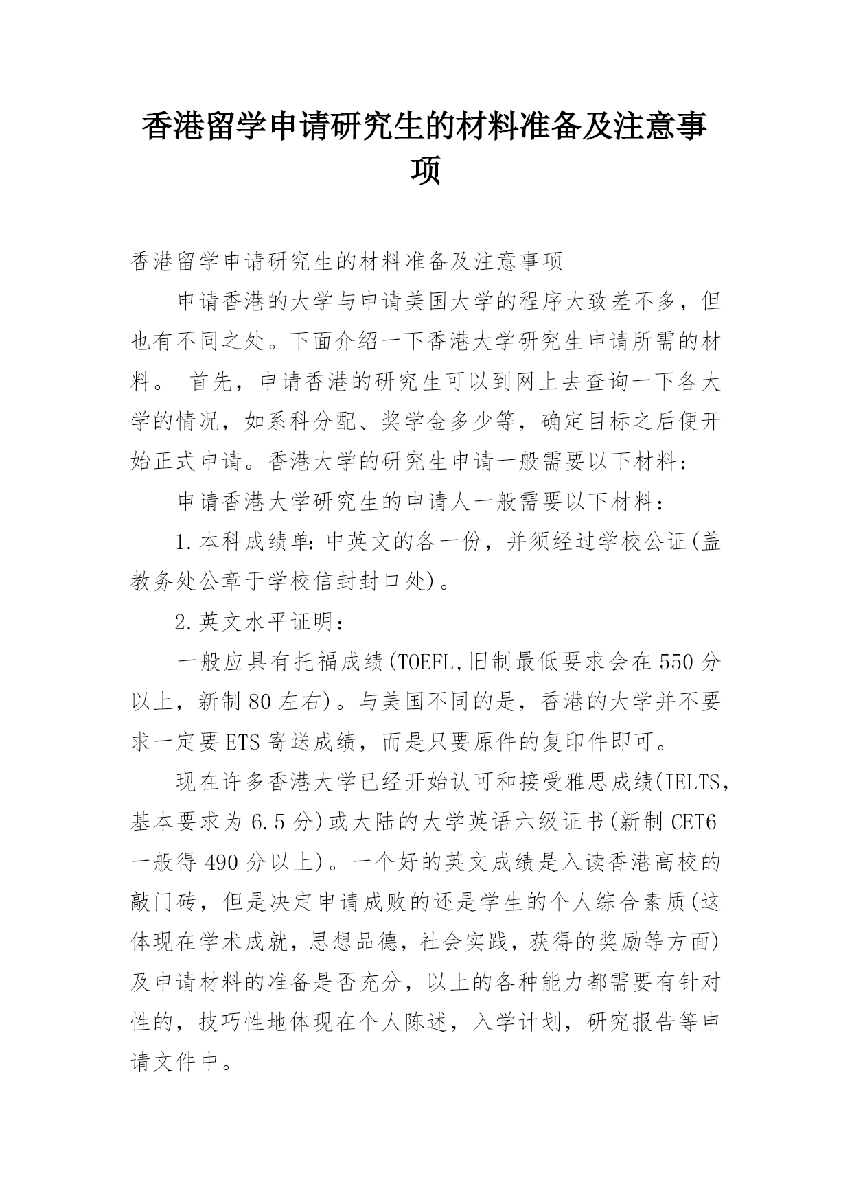 香港留学申请研究生的材料准备及注意事项香港留学申请研究生的材料准备及注意事项申请香港的大学与申请美国大学的程序大致差不多,但也有不同之处。下面介绍一下香港大学研究生申请所需的材料。首先,申请香港的研究生可以到网上去查询一下各大学的情况,如系科分配、奖学金多少等,确定目标之后便开始正式申请。香港大学的研究生申请一般需要以下材料:申请香港大学研究生的申请人一般需要以下材料:1.本科成绩单:中英文的各一份,并须经过学校公证(盖教务处公章于学校信封封口处)。2.英文水平证明:一般应具有托福成绩(TOEFL,旧制最