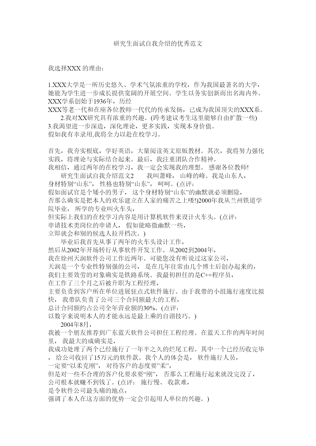 研究生面试自我介绍的优秀范文我选择XXX的理由:1.XXX大学是一所历史悠久、学术气氛浓重的学校,作为我国最著名的大学,她能为学生进一步成长提供宽阔的开展空间。学生以务实创新而出名海内外。XXX学系创始于1936年,历经XXX等老一代和在座各位教师一代代的传承发扬,已成为我国顶尖的XXX系。2.我对XX研究具有浓重的兴趣。(跨考建议考生这里能够自由扩散一些)3.我渴望进一步深造,深化理论,更多实践,实现本身价值。假如我有幸录用,我将全力以赴在校学习。首先,我夯实根底,学好英语,大量阅读英文原版教材。其次,