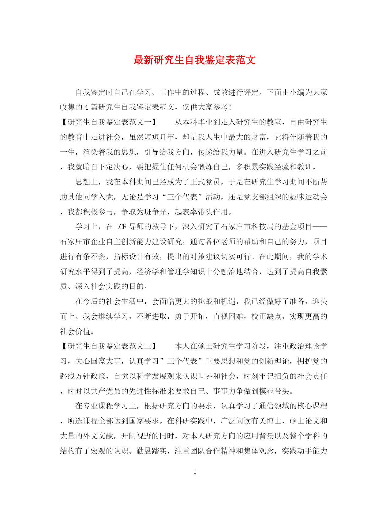 此资料由网络收集而来,如有侵权请告知上传者立即删除。资料共分享,我们负责传递知识。PAGEPAGE4最新研究生自我鉴定表范文自我鉴定时自己在学习、工作中的过程、成效进行评定。下面由小编为大家收集的4篇研究生自我鉴定表范文,仅供大家参考!【研究生自我鉴定表范文一】从本科毕业到走入研究生的教室,再由研究生的教育中走进社会,虽然短短几年,却是我人生中最大的财富,它将伴随着我的一生,渲染着我的思想,引导给我方向,传递给我力量。在进入研究生学习之前,我就暗自下定决心,要把握住任何机会锻炼自己,多积累实践