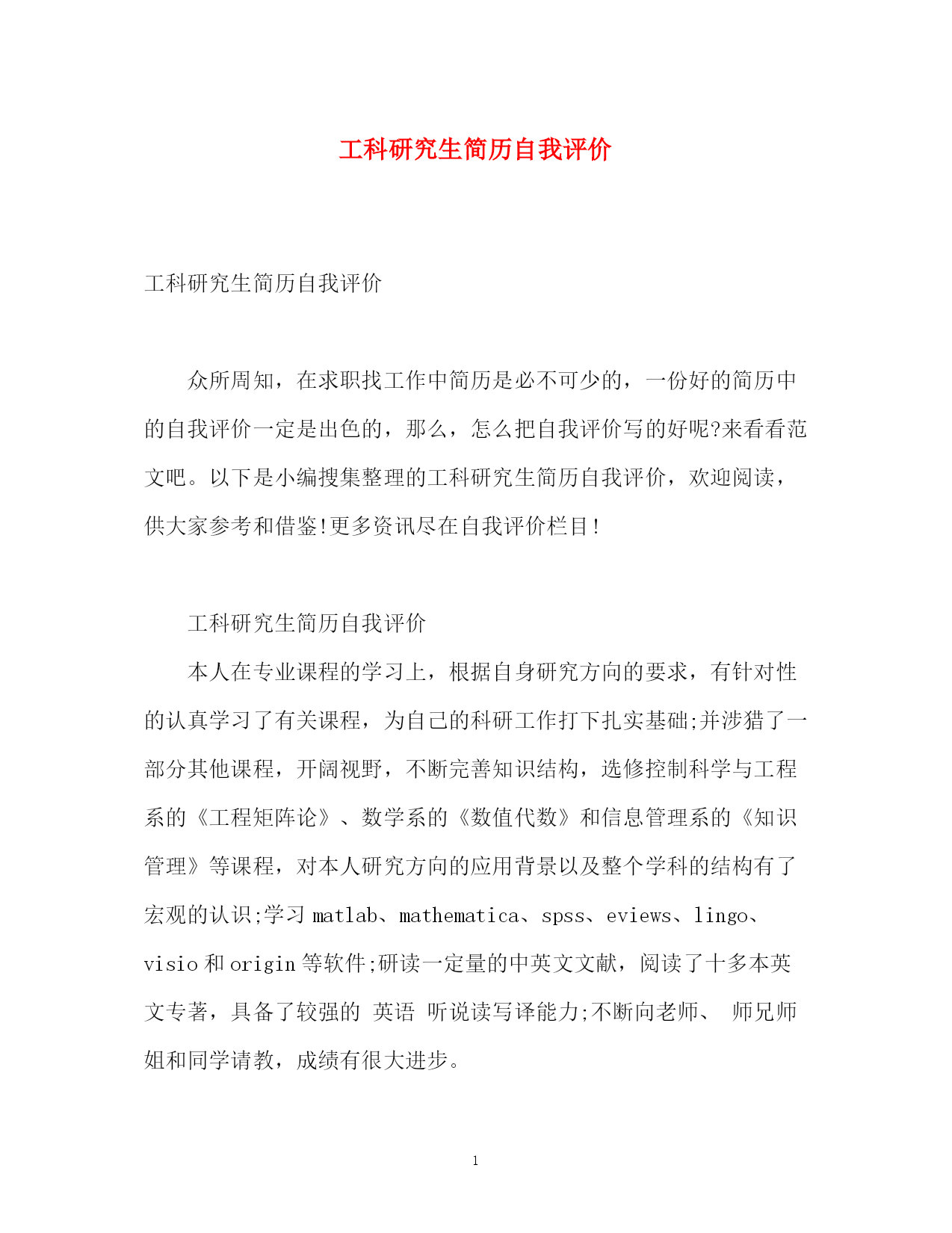 此资料由网络收集而来,如有侵权请告知上传者立即删除。资料共分享,我们负责传递知识。PAGEPAGE5工科研究生简历自我评价工科研究生简历自我评价众所周知,在求职找工作中简历是必不可少的,一份好的简历中的自我评价一定是出色的,那么,怎么把自我评价写的好呢?来看看范文吧。以下是小编搜集整理的工科研究生简历自我评价,欢迎阅读,供大家参考和借鉴!更多资讯尽在自我评价栏目!工科研究生简历自我评价本人在专业课程的学习上,根据自身研究方向的要求,有针对性的认真学习了有关课程,为自己的科研工作打下扎实基础;并