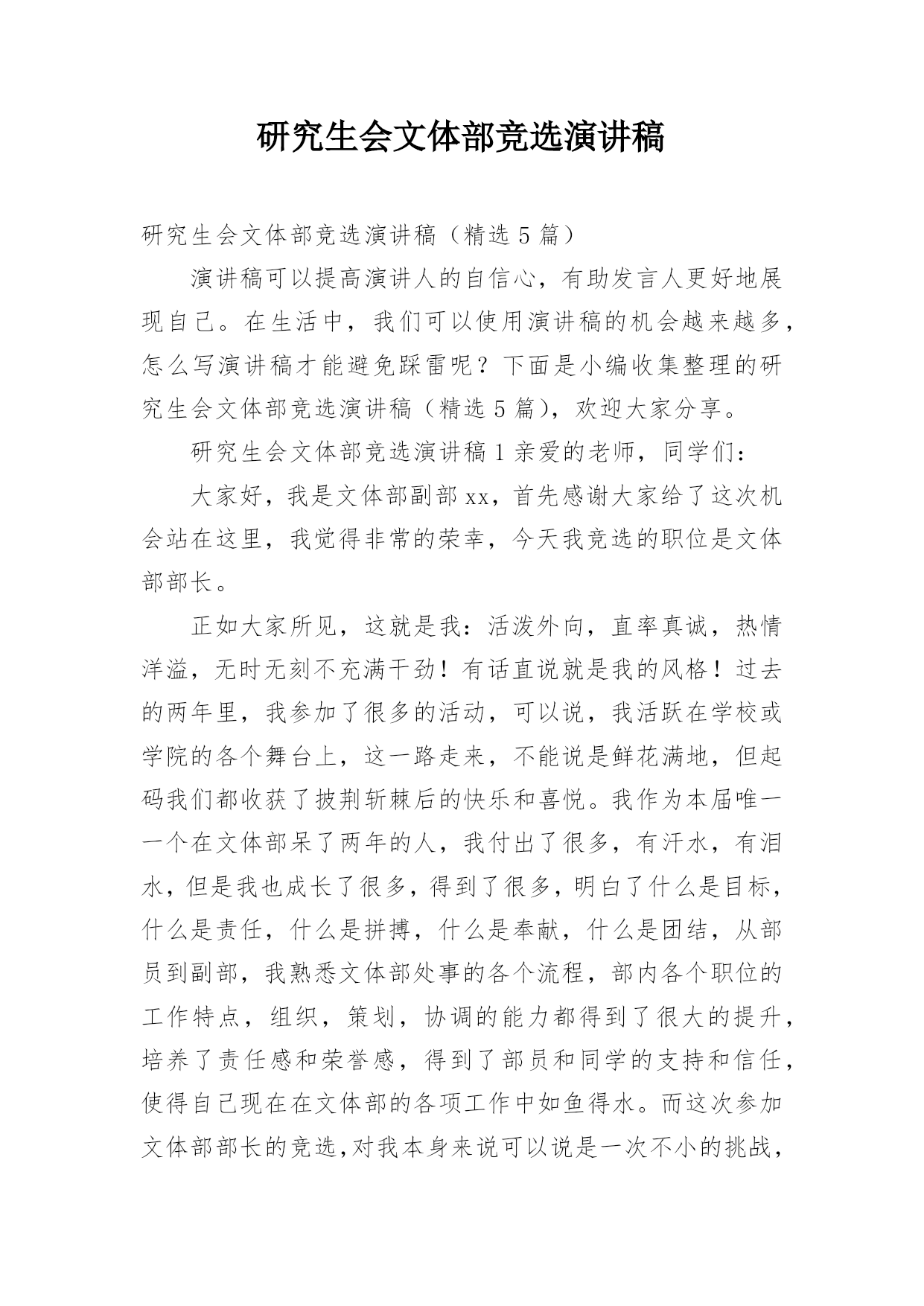 研究生会文体部竞选演讲稿研究生会文体部竞选演讲稿(精选5篇)演讲稿可以提高演讲人的自信心,有助发言人更好地展现自己。在生活中,我们可以使用演讲稿的机会越来越多,怎么写演讲稿才能避免踩雷呢?下面是小编收集整理的研究生会文体部竞选演讲稿(精选5篇),欢迎大家分享。研究生会文体部竞选演讲稿1亲爱的老师,同学们:大家好,我是文体部副部xx,首先感谢大家给了这次机会站在这里,我觉得非常的荣幸,今天我竞选的职位是文体部部长。正如大家所见,这就是我:活泼外向,直率真诚,热情洋溢,无时无刻不充满干劲!有话直说就是我的风格