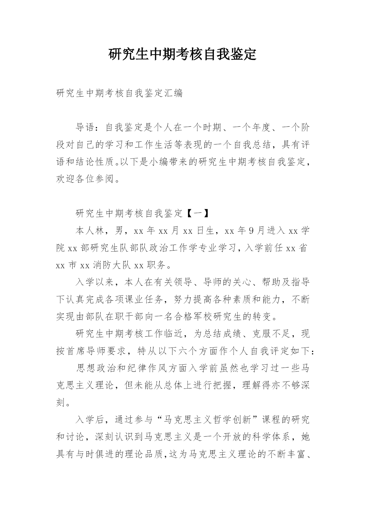 研究生中期考核自我鉴定研究生中期考核自我鉴定汇编导语:自我鉴定是个人在一个时期、一个年度、一个阶段对自己的学习和工作生活等表现的一个自我总结,具有评语和结论性质。以下是小编带来的研究生中期考核自我鉴定,欢迎各位参阅。研究生中期考核自我鉴定【一】本人林,男,xx年xx月xx日生,xx年9月进入xx学院xx部研究生队部队政治工作学专业学习,入学前任xx省xx市xx消防大队xx职务。入学以来,本人在有关领导、导师的关心、帮助及指导下认真完成各项课业任务,努力提高各种素质和能力,不断实现由部队在职干部向一名合格军
