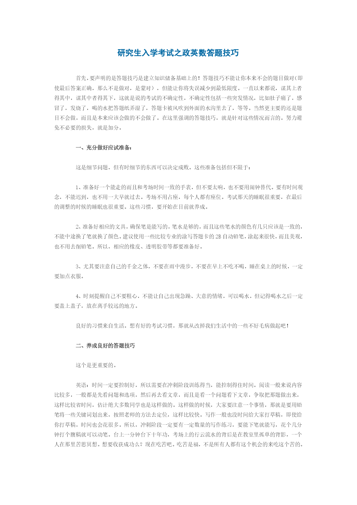 研究生入学考试之政英数答题技巧首先,要声明的是答题技巧是建立知识储备基础上的!答题技巧不能让你本来不会的题目做对(即使最后答案正确,那么不是做对,是蒙对),但能让你将失误减少到最低限度。一直以来都说,谋其上者得其中,谋其中者得其下,这就是说的考试的不确定性,不确定性包括一些突发情况,比如肚子痛了,感冒了,发烧了,喝的水把答题纸弄湿了,答题卡被风吹到外面的水沟里去了,等等。当然更主要的还是题目不会做,而且是本来应该会做的不会做了。在这里强调的答题技巧,就是针对这些情况而言的。努力避免不必要的损失,就是加分。