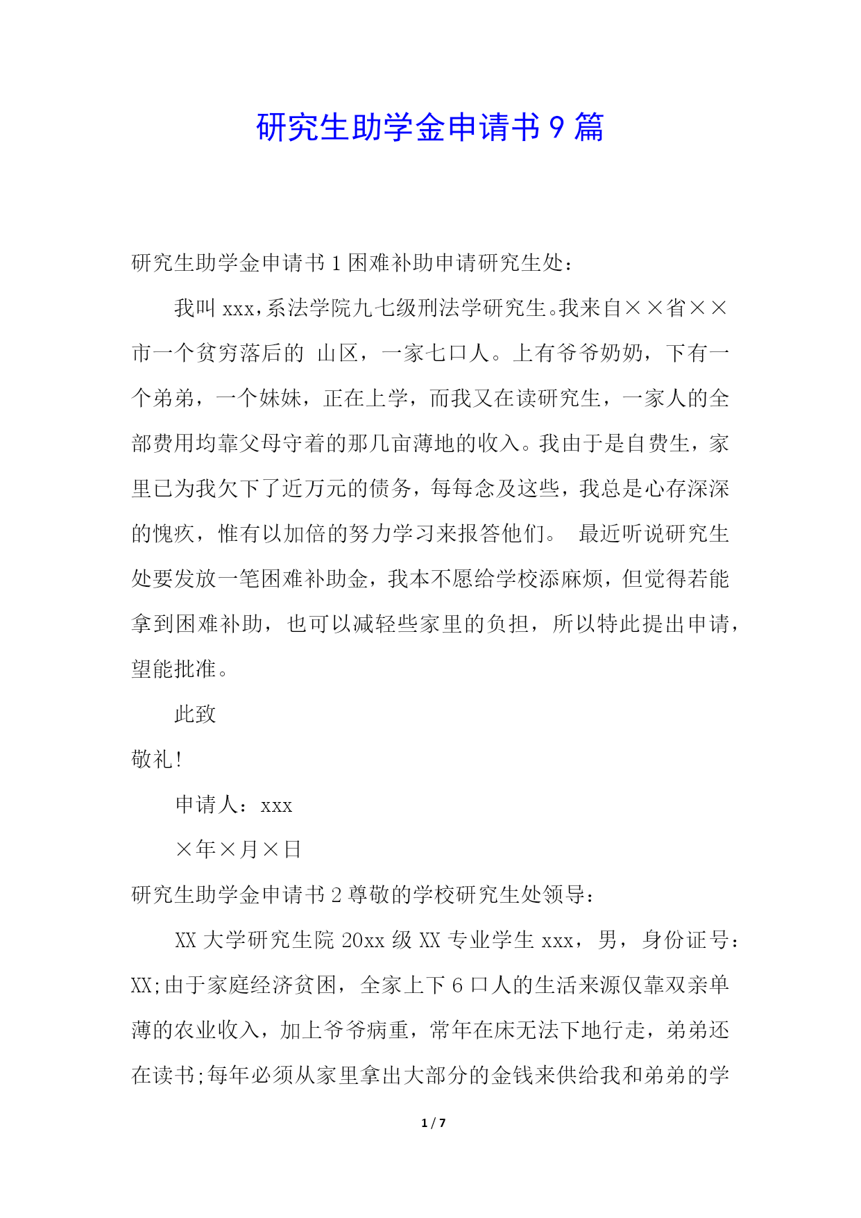 PAGE7/NUMPAGES7研究生助学金申请书9篇研究生助学金申请书1困难补助申请研究生处:我叫xxx,系法学院九七级刑法学研究生。我来自××省××市一个贫穷落后的山区,一家七口人。上有爷爷奶奶,下有一个弟弟,一个妹妹,正在上学,而我又在读研究生,一家人的全部费用均靠父母守着的那几亩薄地的收入。我由于是自费生,家里已为我欠下了近万元的债务,每每念及这些,我总是心存深深的愧疚,惟有以加倍的努力学习来报答他们。最近听说研究生处要发放一笔困难补助金,我本不愿给学校添麻烦,但觉得若能拿到困难补助,也