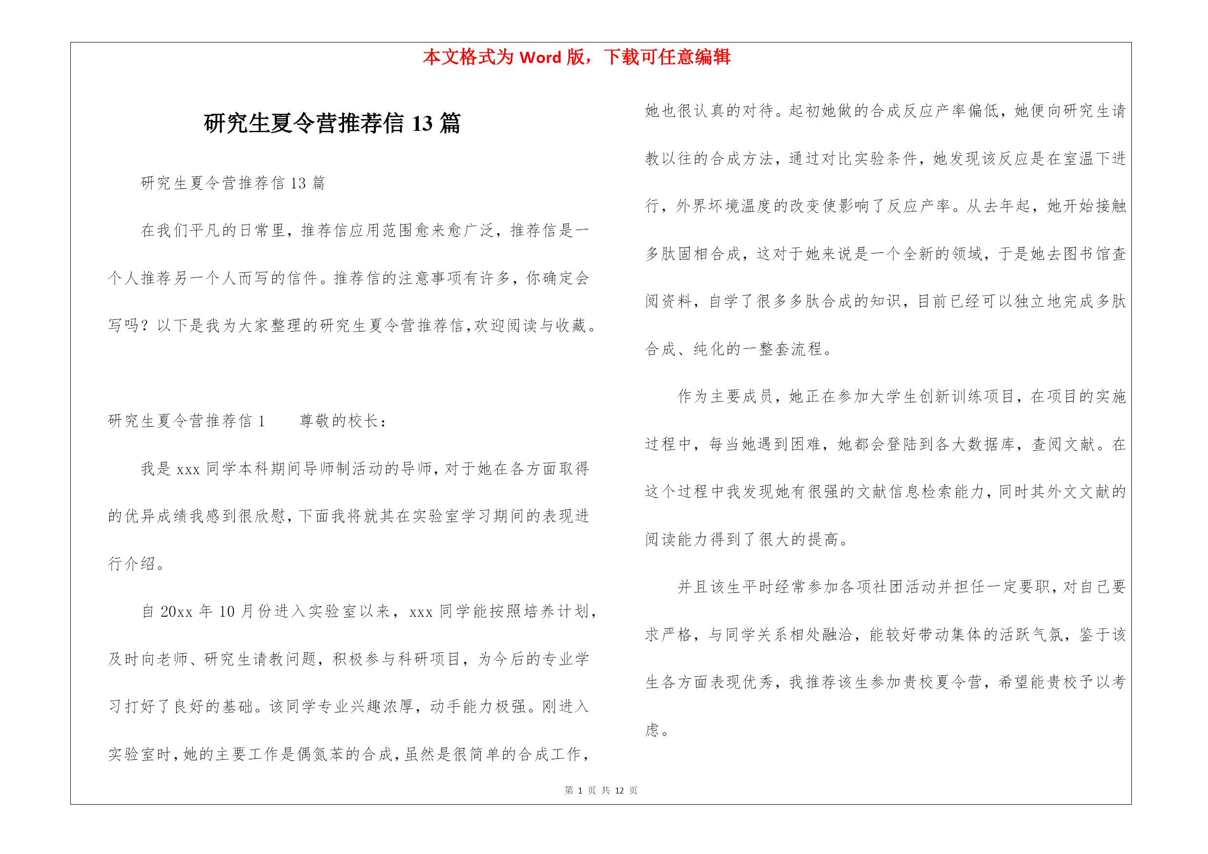 本文格式为Word版,下载可任意编辑第PAGE\*MERGEFORMAT12页共NUMPAGES\*MERGEFORMAT12页研究生夏令营推荐信13篇研究生夏令营推荐信13篇在我们平凡的日常里,推荐信应用范围愈来愈广泛,推荐信是一个人推荐另一个人而写的信件。推荐信的注意事项有许多,你确定会写吗?以下是我为大家整理的研究生夏令营推荐信,欢迎阅读与收藏。研究生夏令营推荐信1尊敬的校长:我是xxx同学本科期间导师制活动的导师,对于她在各方面取得的优异成绩我感到很欣慰,下面我将就其在实验室学习期间的
