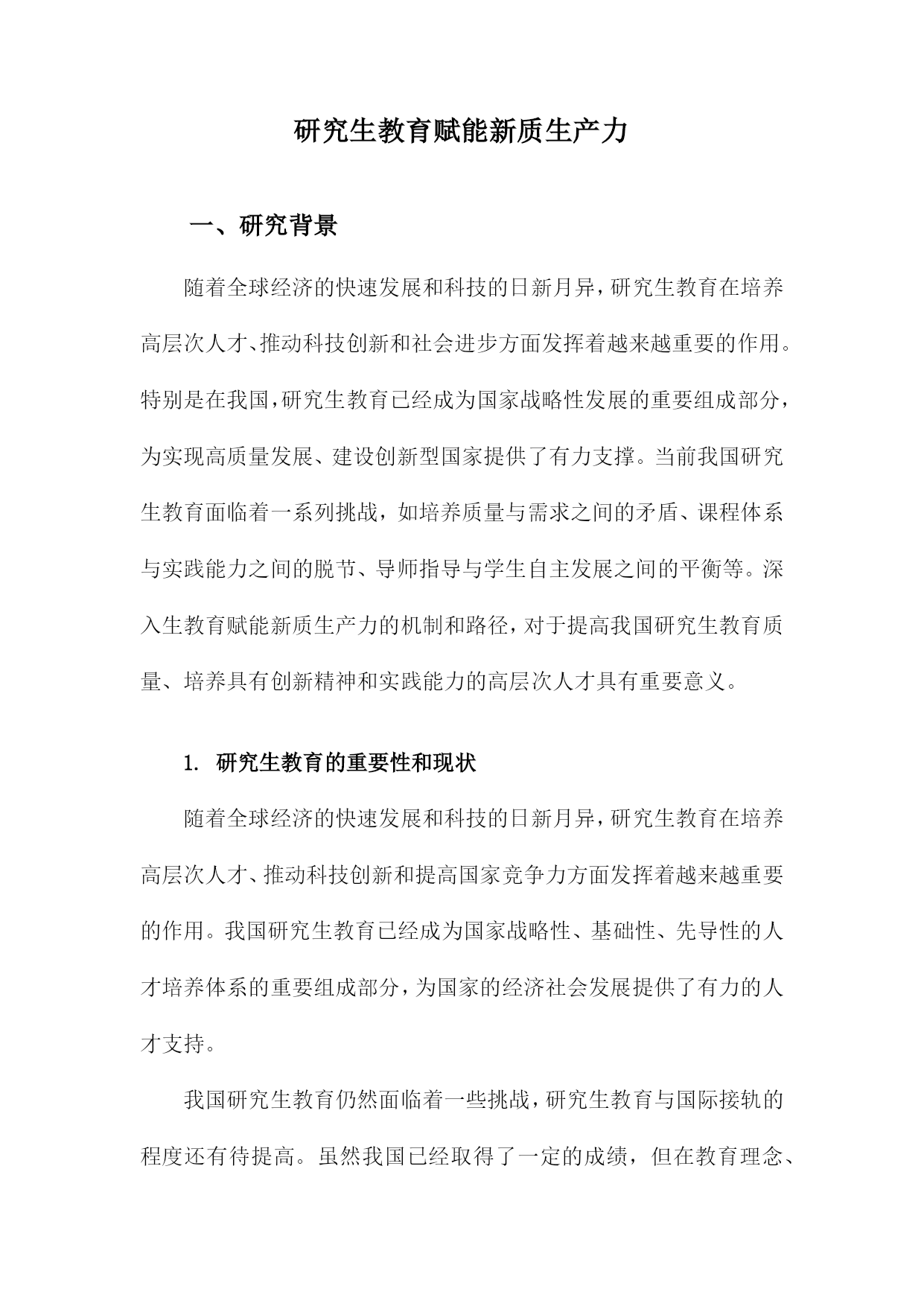 研究生教育赋能新质生产力一、研究背景随着全球经济的快速发展和科技的日新月异,研究生教育在培养高层次人才、推动科技创新和社会进步方面发挥着越来越重要的作用。特别是在我国,研究生教育已经成为国家战略性发展的重要组成部分,为实现高质量发展、建设创新型国家提供了有力支撑。当前我国研究生教育面临着一系列挑战,如培养质量与需求之间的矛盾、课程体系与实践能力之间的脱节、导师指导与学生自主发展之间的平衡等。深入生教育赋能新质生产力的机制和路径,对于提高我国研究生教育质量、培养具有创新精神和实践能力的高层次人才具有重要意义