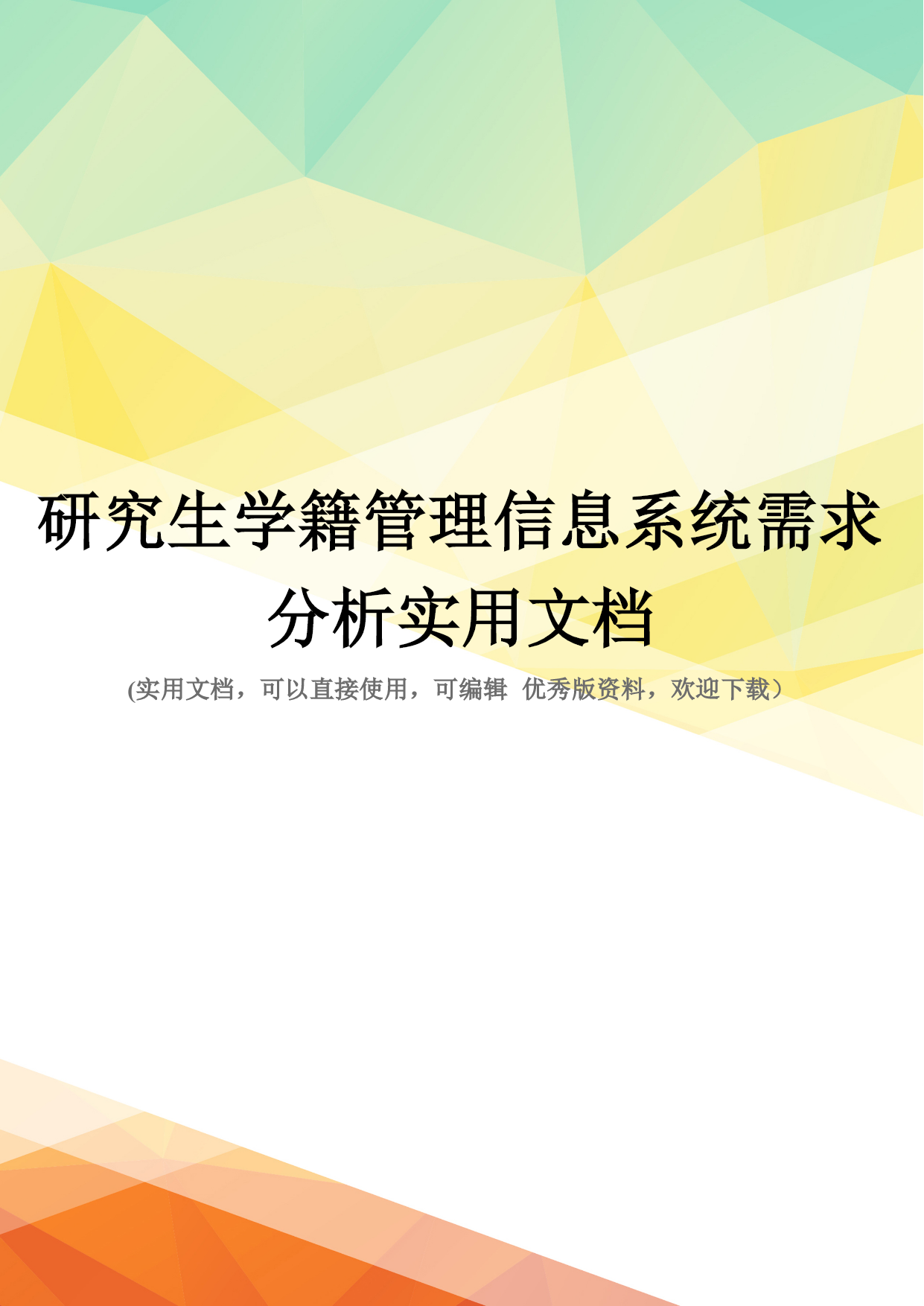 研究生学籍管理信息系统需求分析实用文档(实用文档,可以直接使用,可编辑优秀版资料,欢迎下载)2项目概述现今教室不断的变动,教室信息越来越繁琐,对于教室使用情况管理不方便,所以如今开发这套软件以便管理者对教室使用情况快捷、准确的查询。2。1系统建设背景本系统以西南交通大学内部网为基础进行开发。学校内部网通过联通网络同时可以全国范围内使用,网络带宽可以满足数据库系统的实时操作要求。2.1.1系统规模由于所有教室都是在学校内部,但教室管理活动却可能分布于几个校区(甚至全国各地),因此教室管理系统十一个用户地域分