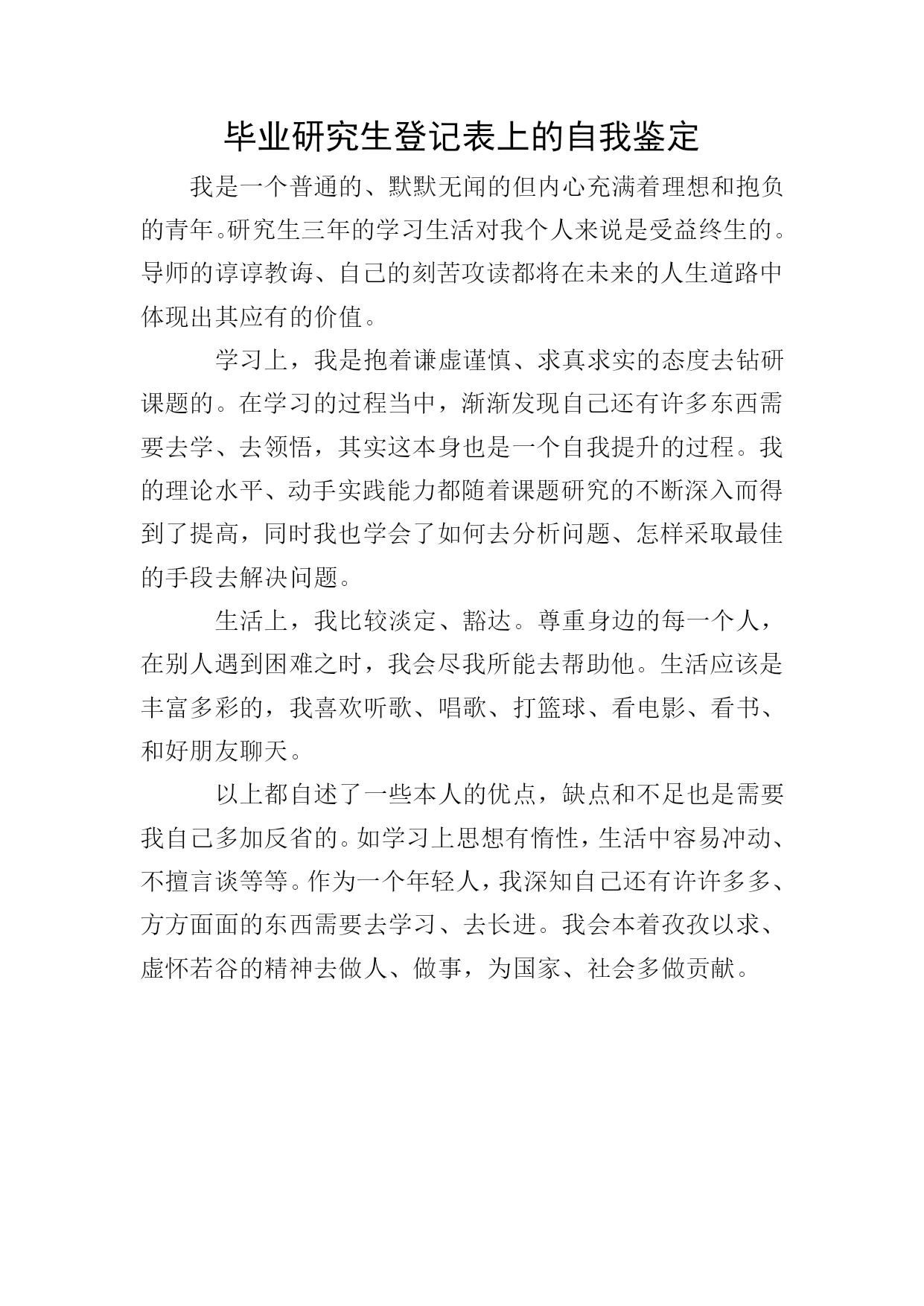 毕业研究生登记表上的自我鉴定我是一个普通的、默默无闻的但内心充满着理想和抱负的青年。研究生三年的学习生活对我个人来说是受益终生的。导师的谆谆教诲、自己的刻苦攻读都将在未来的人生道路中体现出其应有的价值。学习上,我是抱着谦虚谨慎、求真求实的态度去钻研课题的。在学习的过程当中,渐渐发现自己还有许多东西需要去学、去领悟,其实这本身也是一个自我提升的过程。我的理论水平、动手实践能力都随着课题研究的不断深入而得到了提高,同时我也学会了如何去分析问题、怎样采取最佳的手段去解决问题。生活上,我比较淡定、豁达。尊重身边的