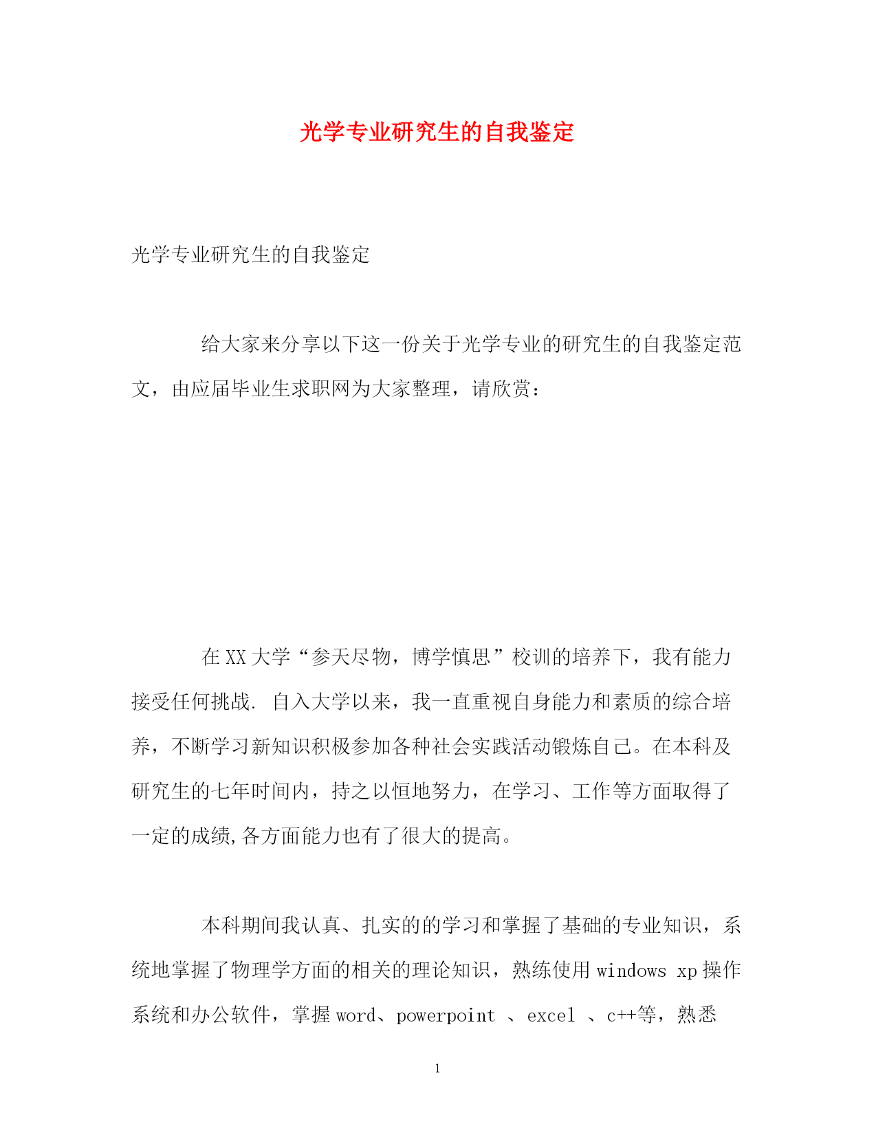 此资料由网络收集而来,如有侵权请告知上传者立即删除。资料共分享,我们负责传递知识。PAGEPAGE3光学专业研究生的自我鉴定光学专业研究生的自我鉴定给大家来分享以下这一份关于光学专业的研究生的自我鉴定范文,由应届毕业生求职网为大家整理,请欣赏:在XX大学“参天尽物,博学慎思”校训的培养下,我有能力接受任何挑战.自入大学以来,我一直重视自身能力和素质的综合培养,不断学习新知识积极参加各种社会实践活动锻炼自己。在本科及研究生的七年时间内,持之以恒地努力,在学习、工作等方面取得了一定的成绩,各方面能