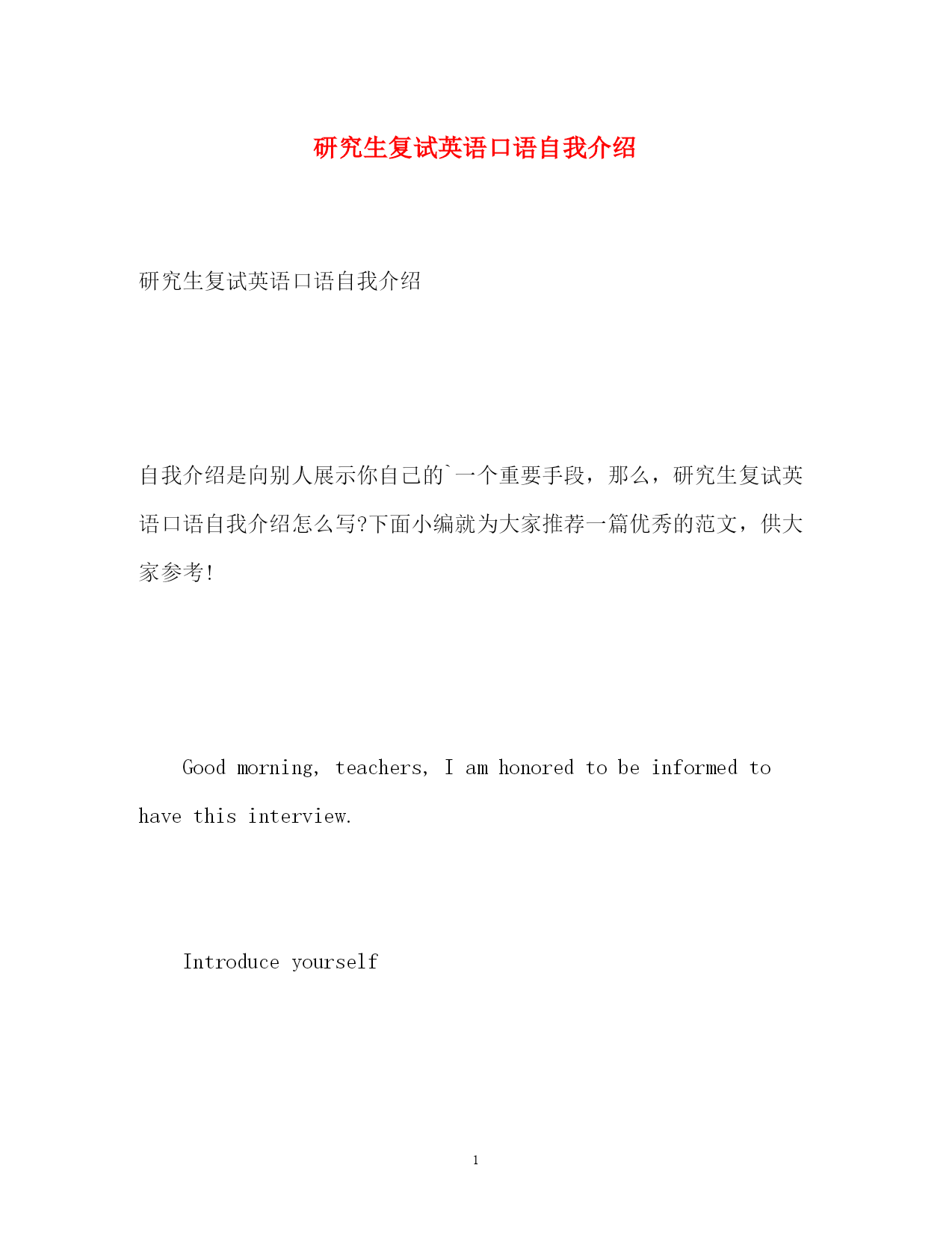 此资料由网络收集而来,如有侵权请告知上传者立即删除。资料共分享,我们负责传递知识。PAGEPAGE7研究生复试英语口语自我介绍研究生复试英语口语自我介绍自我介绍是向别人展示你自己的`一个重要手段,那么,研究生复试英语口语自我介绍怎么写?下面小编就为大家推荐一篇优秀的范文,供大家参考!Goodmorning,teachers,Iamhonoredtobeinformedtohavethisinterview.IntroduceyourselfFirstletmeintroducemyself,m