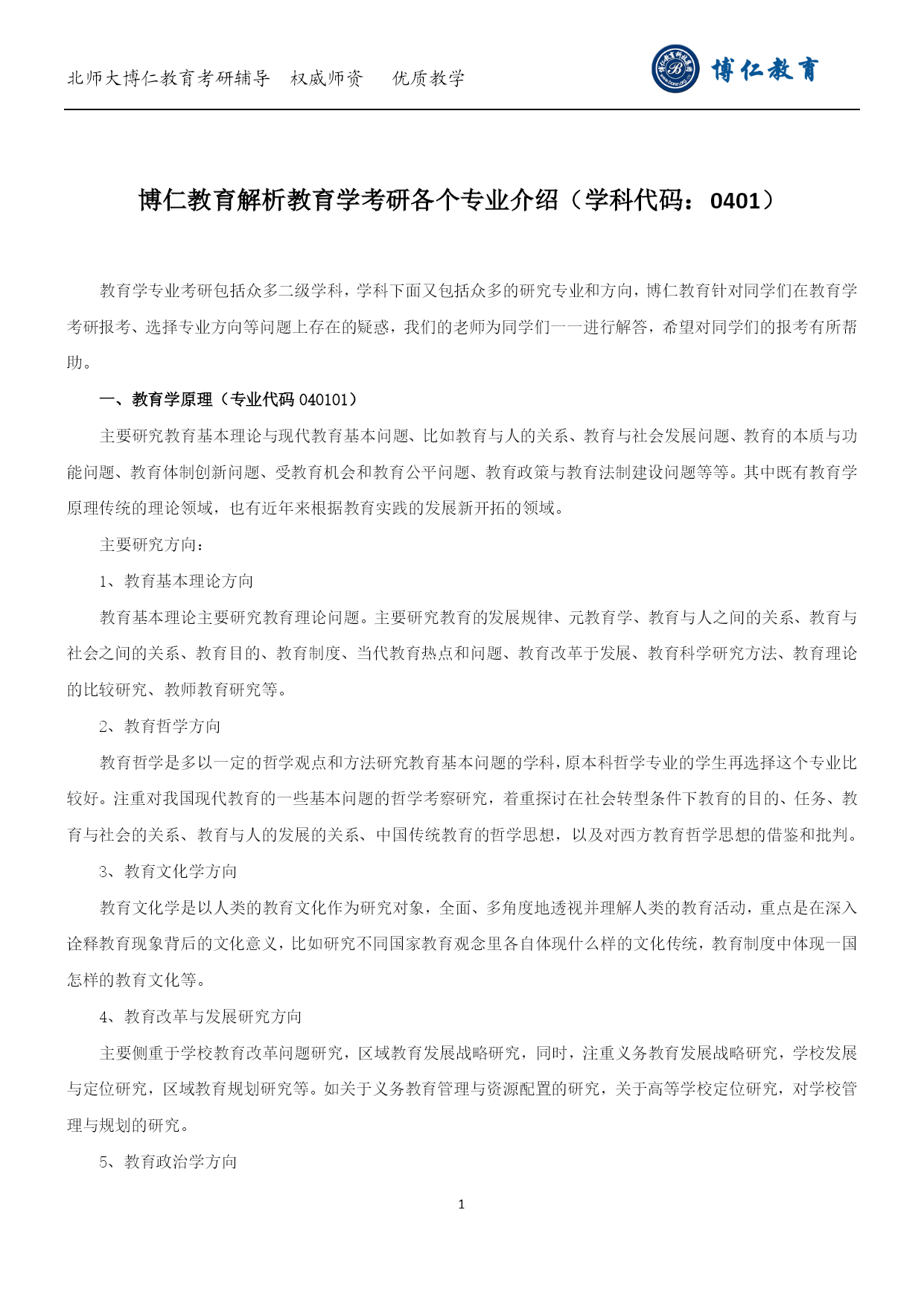 北师大博仁教育考研辅导权威师资优质教学PAGE\*MERGEFORMAT5博仁教育解析教育学考研各个专业介绍(学科代码:0401)教育学专业考研包括众多二级学科,学科下面又包括众多的研究专业和方向,博仁教育针对同学们在教育学考研报考、选择专业方向等问题上存在的疑惑,我们的老师为同学们一一进行解答,希望对同学们的报考有所帮助。一、教育学原理(专业代码040101)主要研究教育基本理论与现代教育基本问题、比如教育与人的关系、教育与社会发展问题、教育的本质与功能问题、教育体制创新问题、受教育机会和教育公平