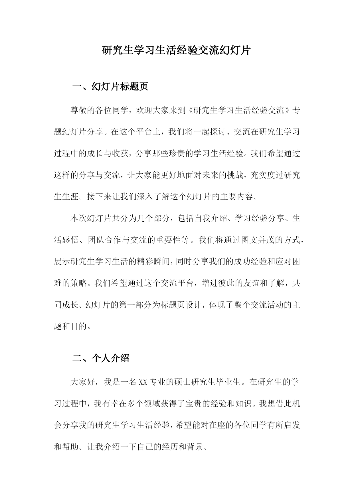 研究生学习生活经验交流幻灯片一、幻灯片标题页尊敬的各位同学,欢迎大家来到《研究生学习生活经验交流》专题幻灯片分享。在这个平台上,我们将一起探讨、交流在研究生学习过程中的成长与收获,分享那些珍贵的学习生活经验。我们希望通过这样的分享与交流,让大家能更好地面对未来的挑战,充实度过研究生生涯。接下来让我们深入了解这个幻灯片的主要内容。本次幻灯片共分为几个部分,包括自我介绍、学习经验分享、生活感悟、团队合作与交流的重要性等。我们将通过图文并茂的方式,展示研究生学习生活的精彩瞬间,同时分享我们的成功经验和应对困难的