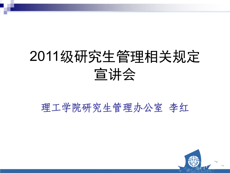 2011级研究生管理相关规定宣讲会理工学院研究生管理办公室主要内容1.研究生教务系统培养计划1.在导师指导下根据培养方案确定个人培养计划;2.登陆“学生空间”,网上录入培养计划,打印后交导师签字后交学院2份,学生、导师保留1份。选择导师导师签名选课方法登陆“学生空间”,根据导师制定的个人培养计划及课程表进行选课,三年制24-28学分(按照系里的要求),两年制专业学位32学分,超出学分要收费。选课时间:9月9日至9月19日调整、退选时间:9月20日至9月23日三年制的英语(上学期)、政治(下学期)以研究生院