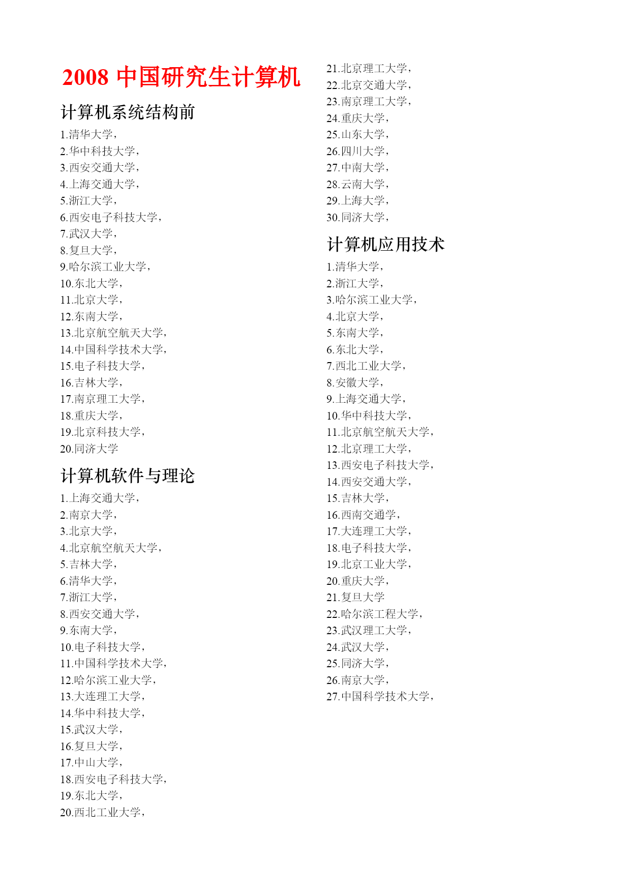 2008中国研究生计算机计算机系统结构前1.清华大学,2.华中科技大学,3.西安交通大学,4.上海交通大学,5.浙江大学,6.西安电子科技大学,7.武汉大学,8.复旦大学,9.哈尔滨工业大学,10.东北大学,11.北京大学,12.东南大学,13.北京航空航天大学,14.中国科学技术大学,15.电子科技大学,16.吉林大学,17.南京理工大学,18.重庆大学,19.北京科技大学,20.同济大学计算机软件与理论1.上海交通大学,2.南京大学,3.北京大学,4.北京航空航天大学,5.吉林大学,6.清华大学,7.