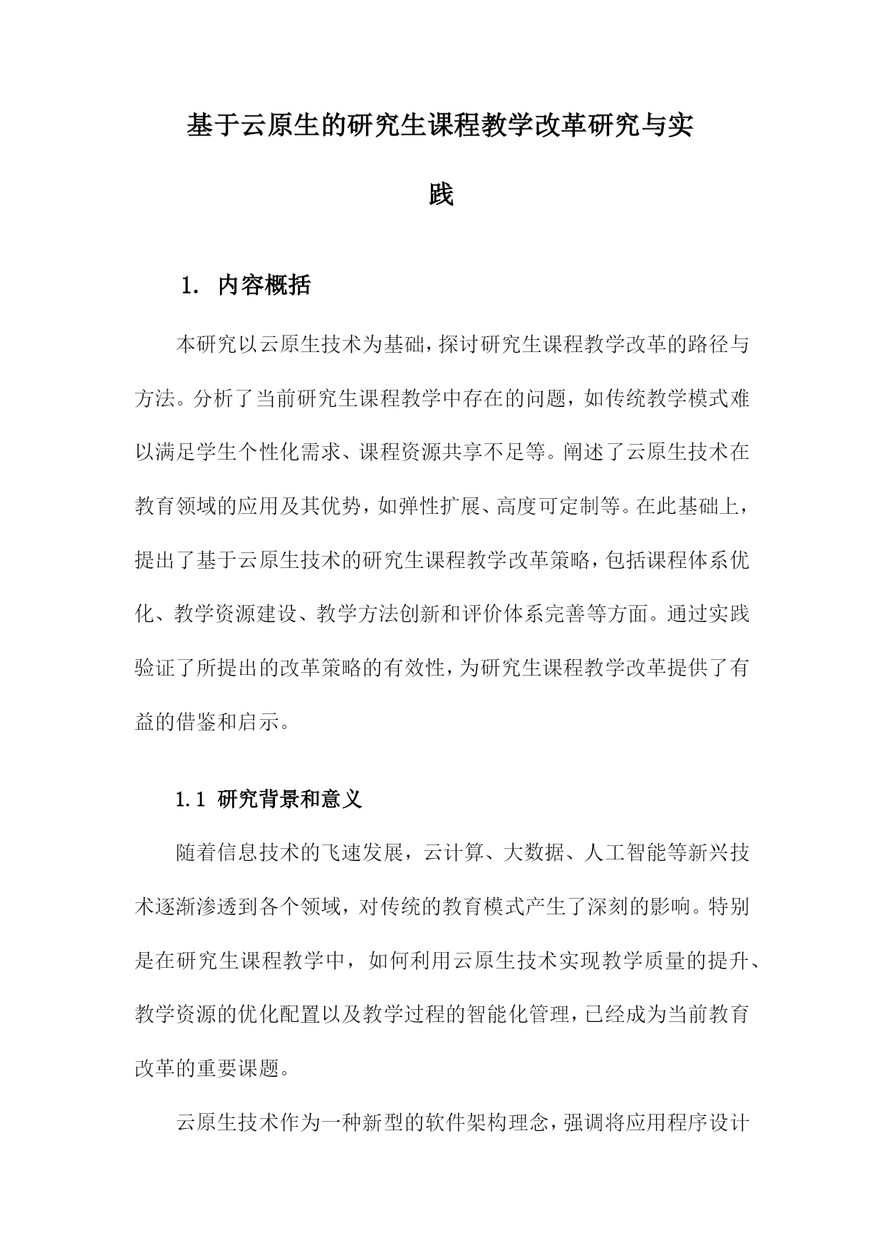 基于云原生的研究生课程教学改革研究与实践1.内容概括本研究以云原生技术为基础,探讨研究生课程教学改革的路径与方法。分析了当前研究生课程教学中存在的问题,如传统教学模式难以满足学生个性化需求、课程资源共享不足等。阐述了云原生技术在教育领域的应用及其优势,如弹性扩展、高度可定制等。在此基础上,提出了基于云原生技术的研究生课程教学改革策略,包括课程体系优化、教学资源建设、教学方法创新和评价体系完善等方面。通过实践验证了所提出的改革策略的有效性,为研究生课程教学改革提供了有益的借鉴和启示。1.1研究背景和意义随着