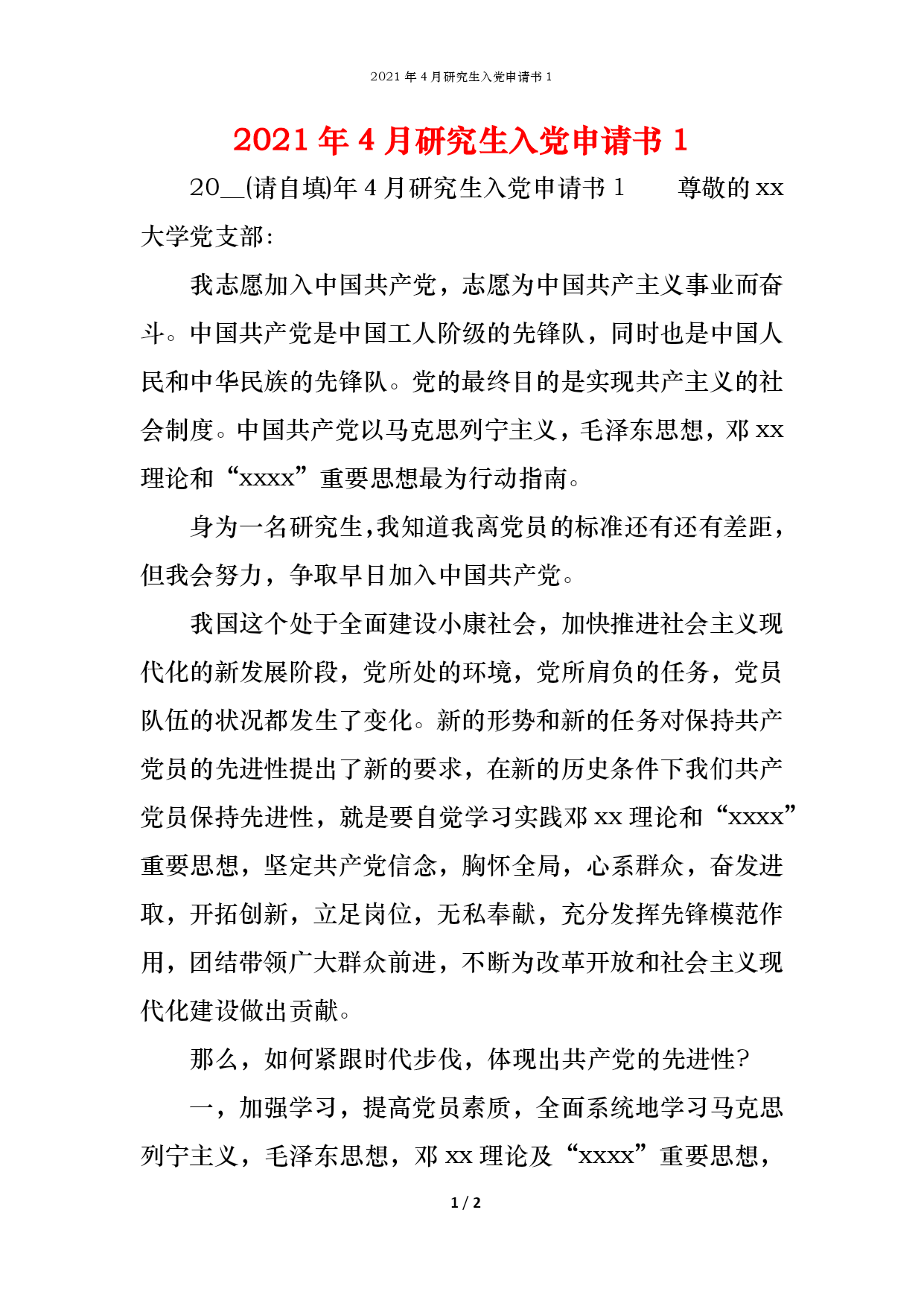 2021年4月研究生入党申请书1PAGE2/NUMPAGES22021年4月研究生入党申请书120__(请自填)年4月研究生入党申请书1尊敬的xx大学党支部:我志愿加入中国共产党,志愿为中国共产主义事业而奋斗。中国共产党是中国工人阶级的先锋队,同时也是中国人民和中华民族的先锋队。党的最终目的是实现共产主义的社会制度。中国共产党以马克思列宁主义,毛泽东思想,邓xx理论和“xxxx”重要思想最为行动指南。身为一名研究生,我知道我离党员的标准还有还有差距,但我会努力,争取早日加入中国共产党。我国这个