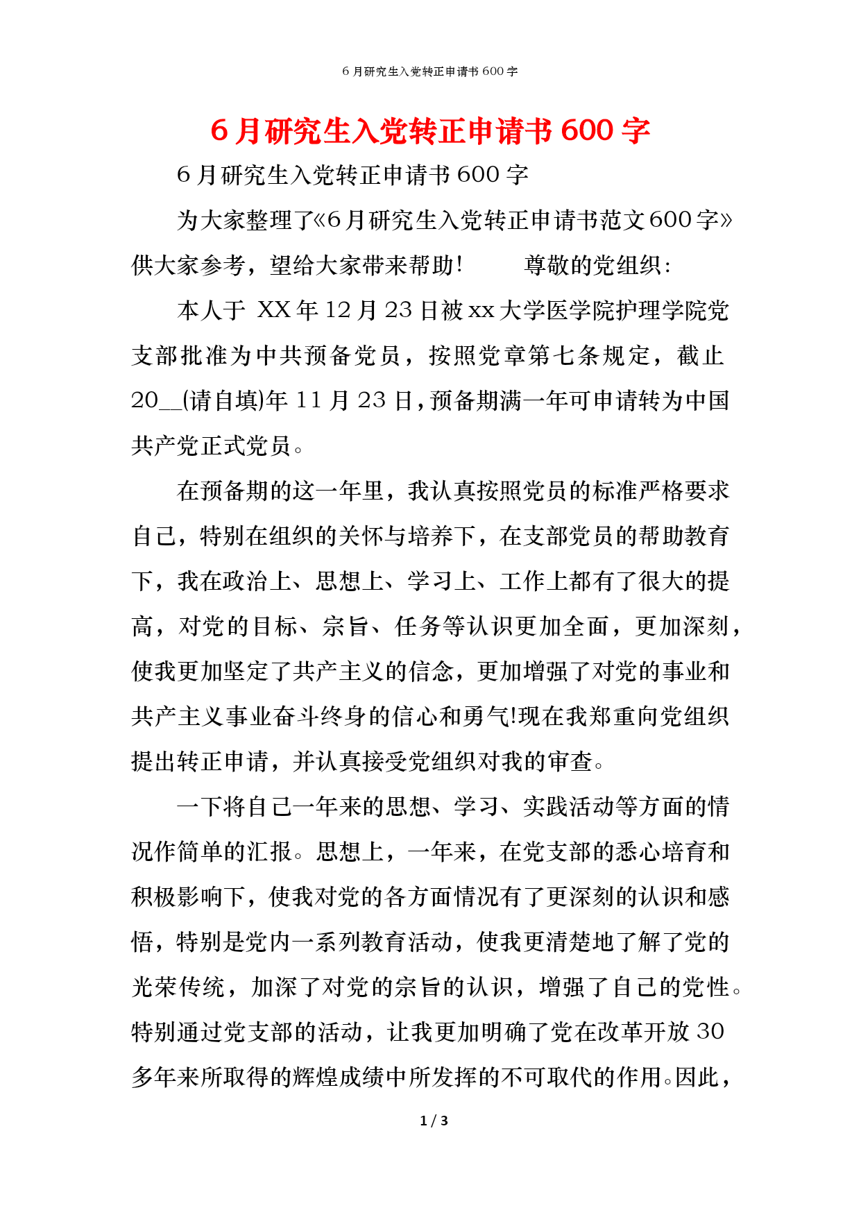 6月研究生入党转正申请书600字PAGE3/NUMPAGES36月研究生入党转正申请书600字6月研究生入党转正申请书600字为大家整理了《6月研究生入党转正申请书范文600字》供大家参考,望给大家带来帮助!尊敬的党组织:本人于XX年12月23日被xx大学医学院护理学院党支部批准为中共预备党员,按照党章第七条规定,截止20__(请自填)年11月23日,预备期满一年可申请转为中国共产党正式党员。在预备期的这一年里,我认真按照党员的标准严格要求自己,特别在组织的关怀与培养下,在支部党员的帮助教育下